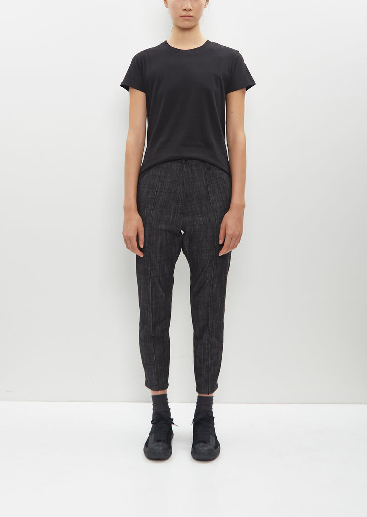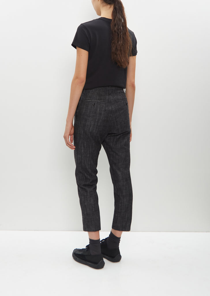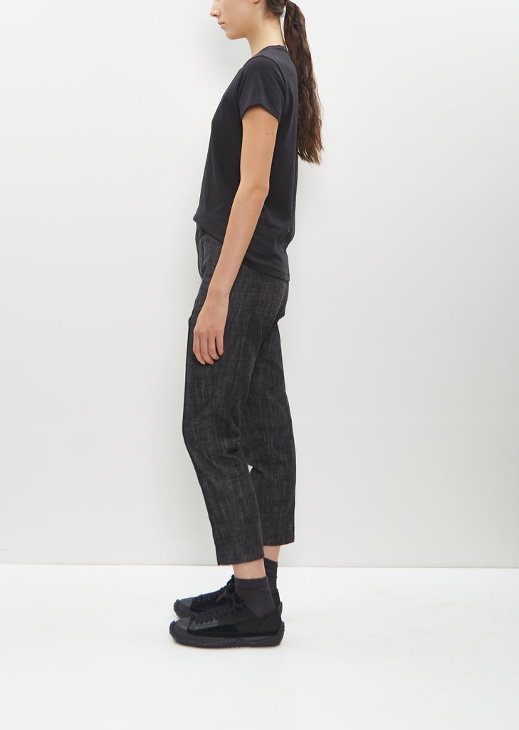 Y's black cropped tapered pant with a closer fit and pintuck at front in soft cotton denim. Features belt loops, side seam pockets, buttoned welt pockets at back, and button and zip-fly closure.