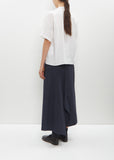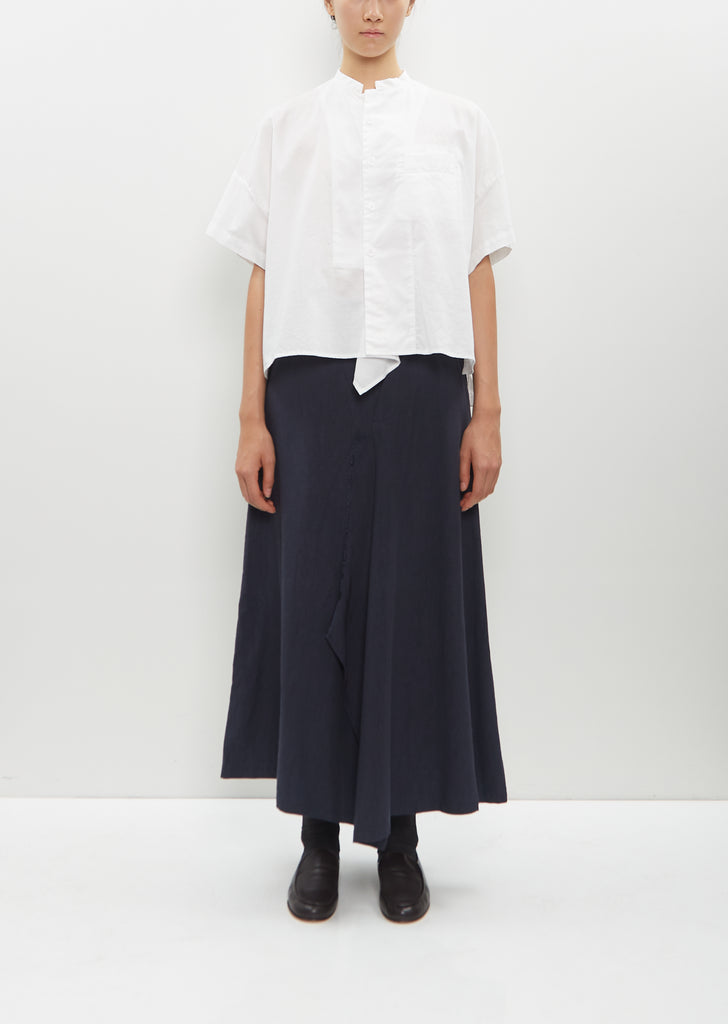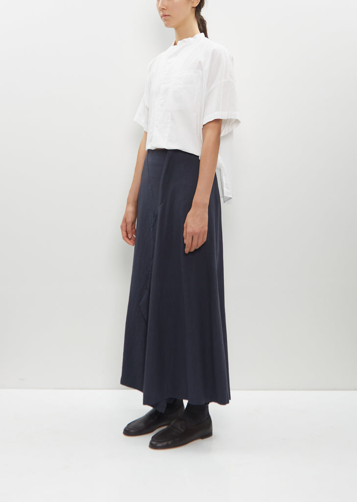 Y's blue grey A-line skirt with raw edge details and drape at hem in linen and cotton blend. Features a pant leg on right side, adjustable tabs at waist, side seam pockets, and hook and eye and concealed zip closure at waist.