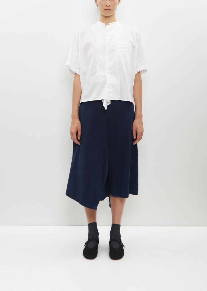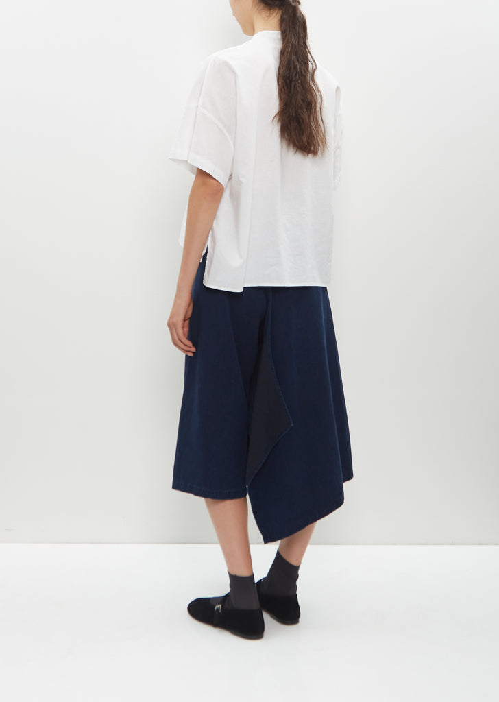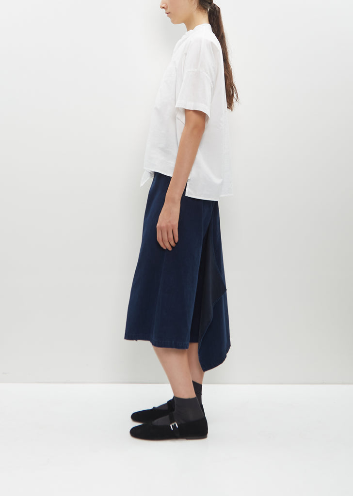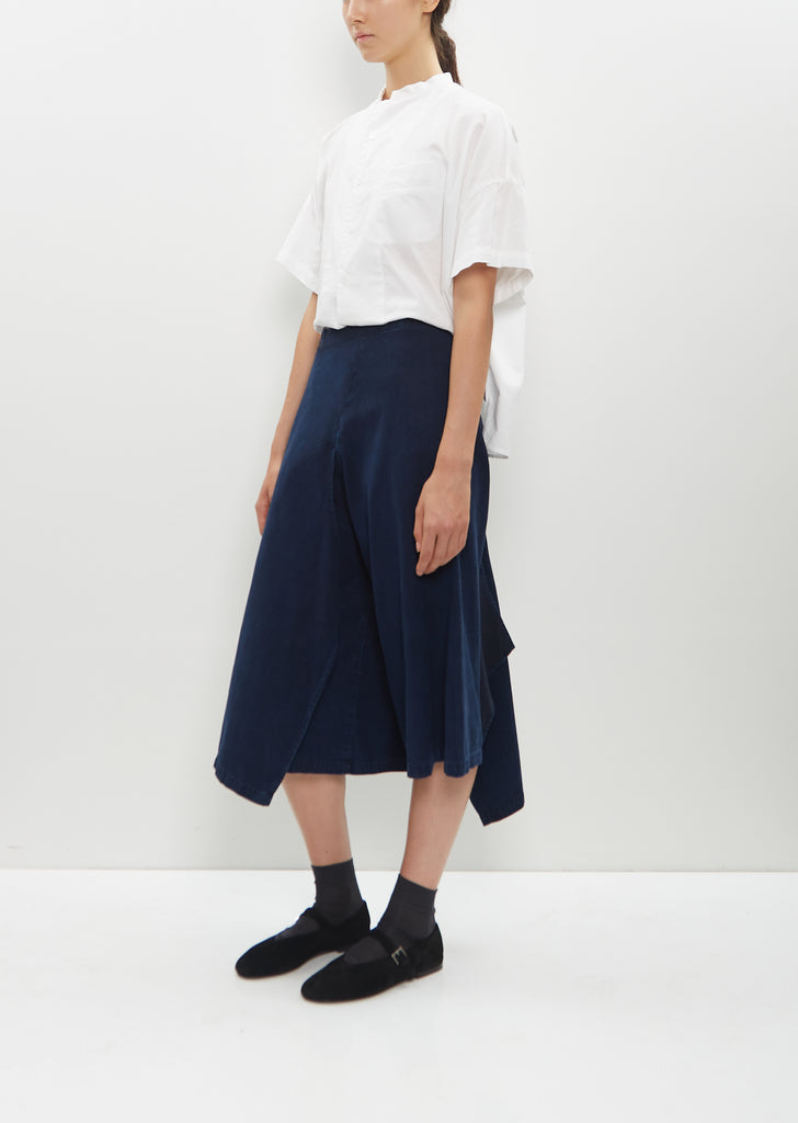 Y's indigo layered pants with right skirt overlay in cellulose and cotton blend twill. Features a clean waist and button and zip-fly closure at side.