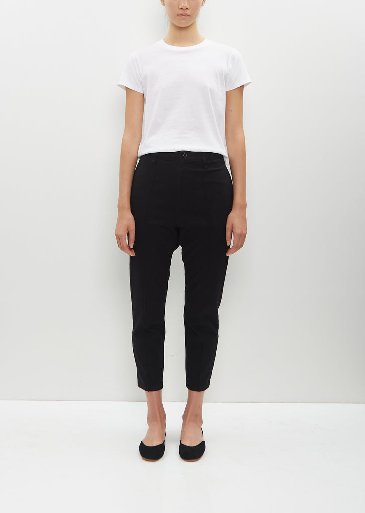 Y's black cropped tapered pant with a closer fit and pintuck at front in soft cotton denim. Features belt loops, side seam pockets, buttoned welt pockets at back, and button and zip-fly closure.