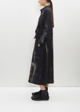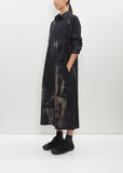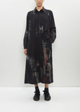 Y's black printed long sleeve shirt dress with a patch drape detail at front in cotton blend twill. Features a classic shirt collar, side welt pockets, buttoned cuffs and buttons closure at front.