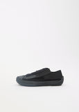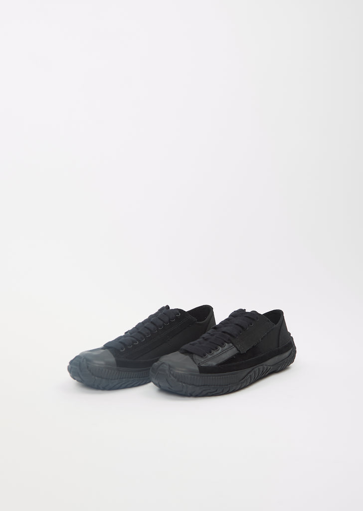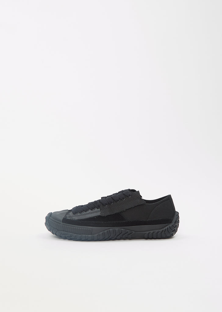 Y's black low cut sneaker with cut out frayed detailing in double layer canvas. Features a round toe and stretch tonal laces. Finished with leather lining and a rubber sole.