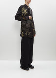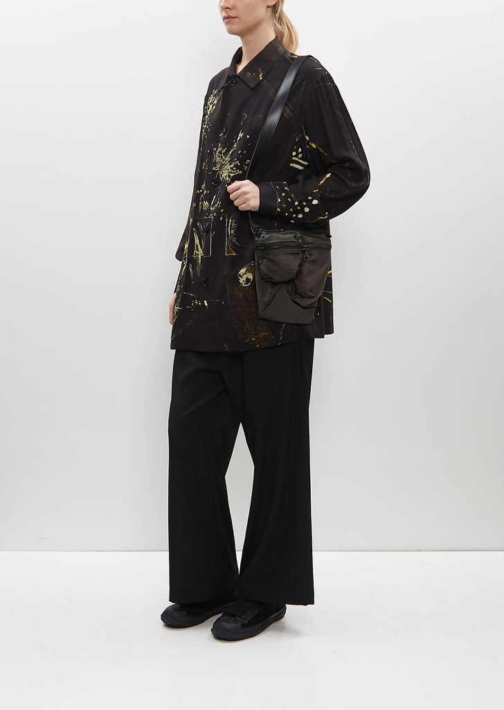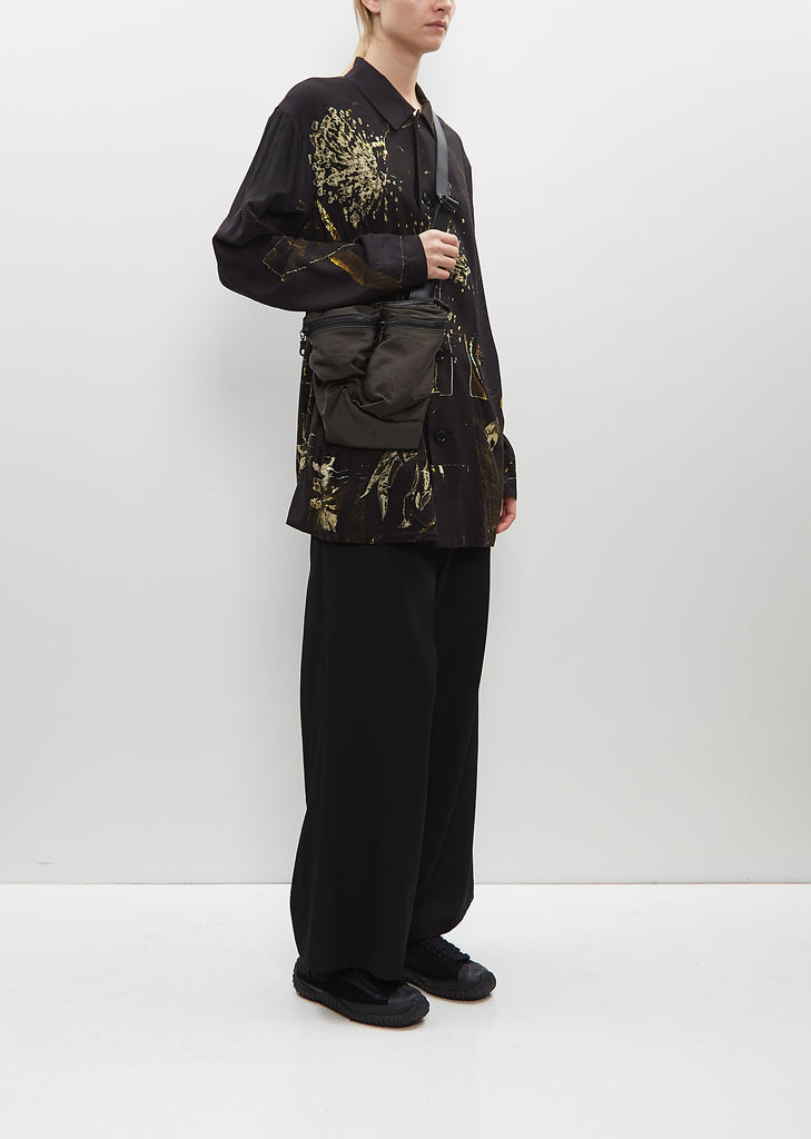 Y's khaki mini shoulder bag with two asymmetrical front zipper pockets and adjustable leather shoulder strap in nylon twill. Features top zip opening and a single interior slip pocket.
