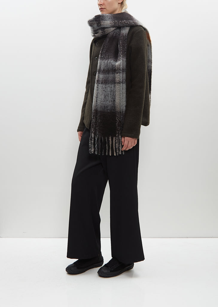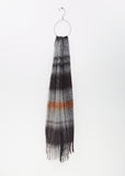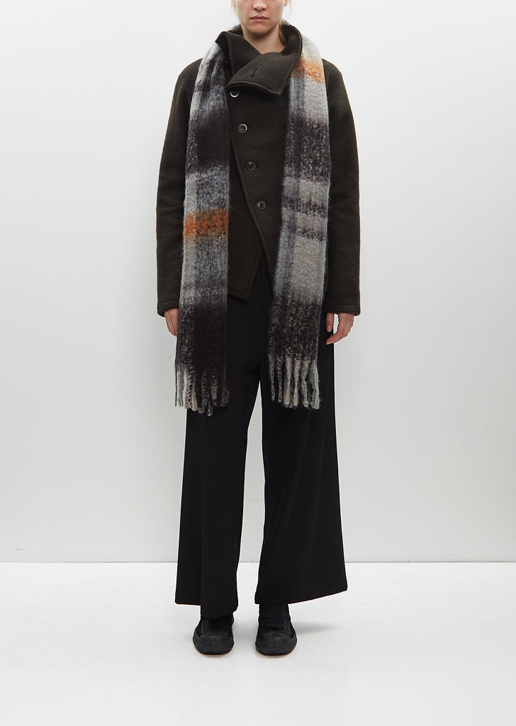 Y's grey, black and orange check rectangular stole with fringed edges in soft mohair blend knit.