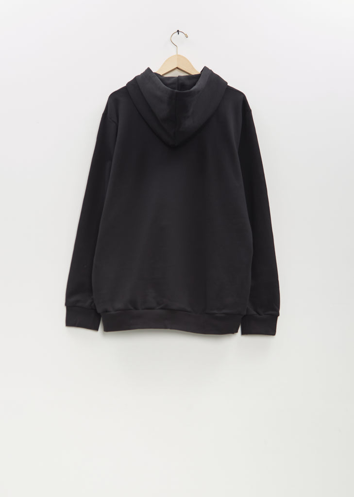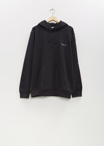 Y-3 black hooded sweatshirt with a drawstring hood and kangaroo pocket in a mid-weight cotton. Features tonal signature stripes at sleeves, dropped shoulders and ribbed trim finish at side panels, cuffs, and hem. Lined in tonal soft terry cloth fabric. Relaxed fit.