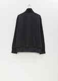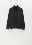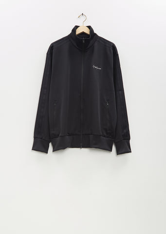 Y-3 black track jacket with a high neck and tonal zipper closure at front in technical cotton. Features tonal signature stripes at sleeves, contrasting white logo at chest, dropped shoulders, zippered pockets at front and ribbed trim finish at side panels, cuffs, and hem. Relaxed fit.