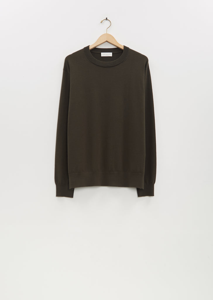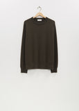 Dries Van Noten dark khaki sweater with a crew neckline in a merino wool knit. Features dropped shoulders and ribbed trim at neckline, cuffs, and hem.