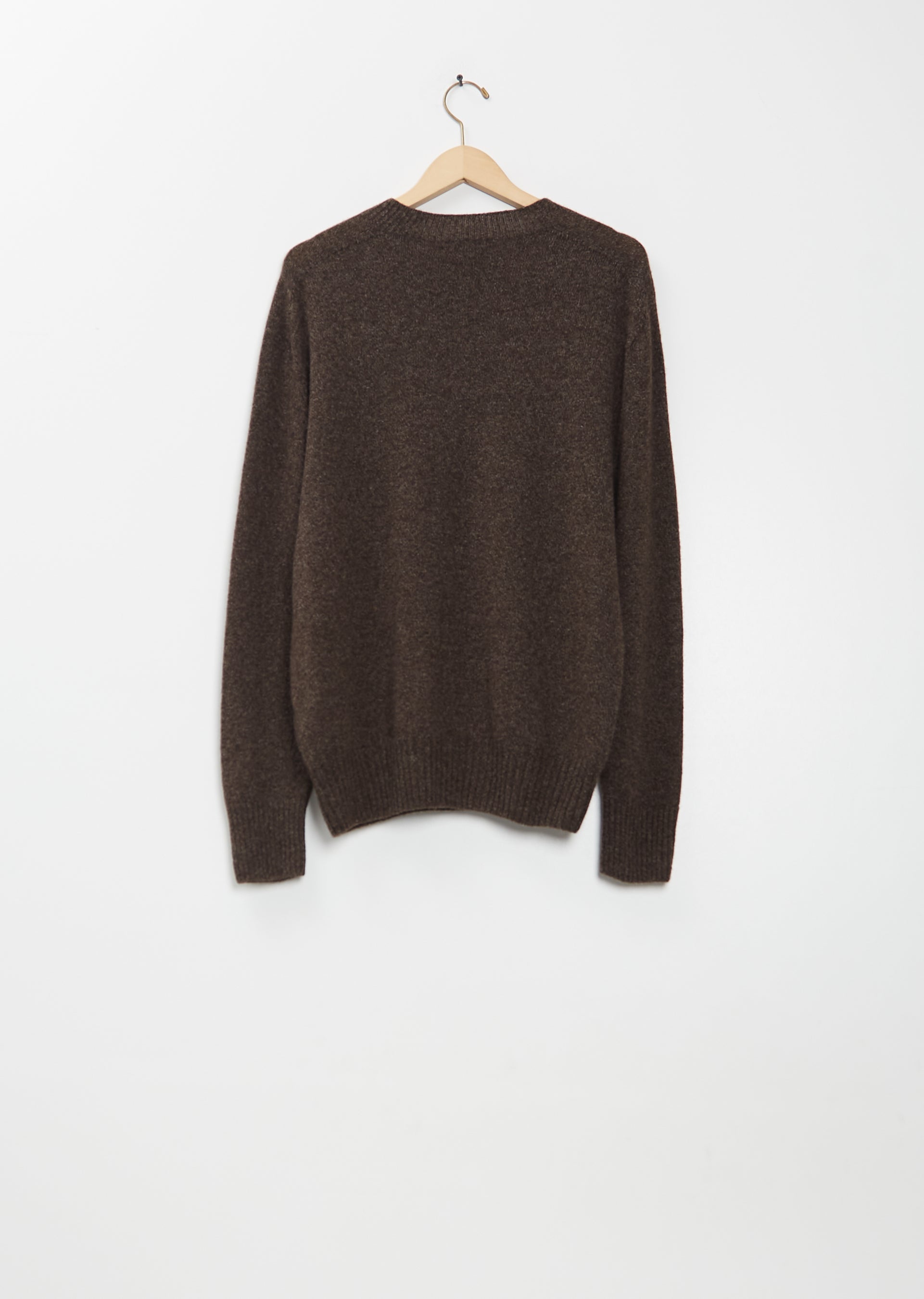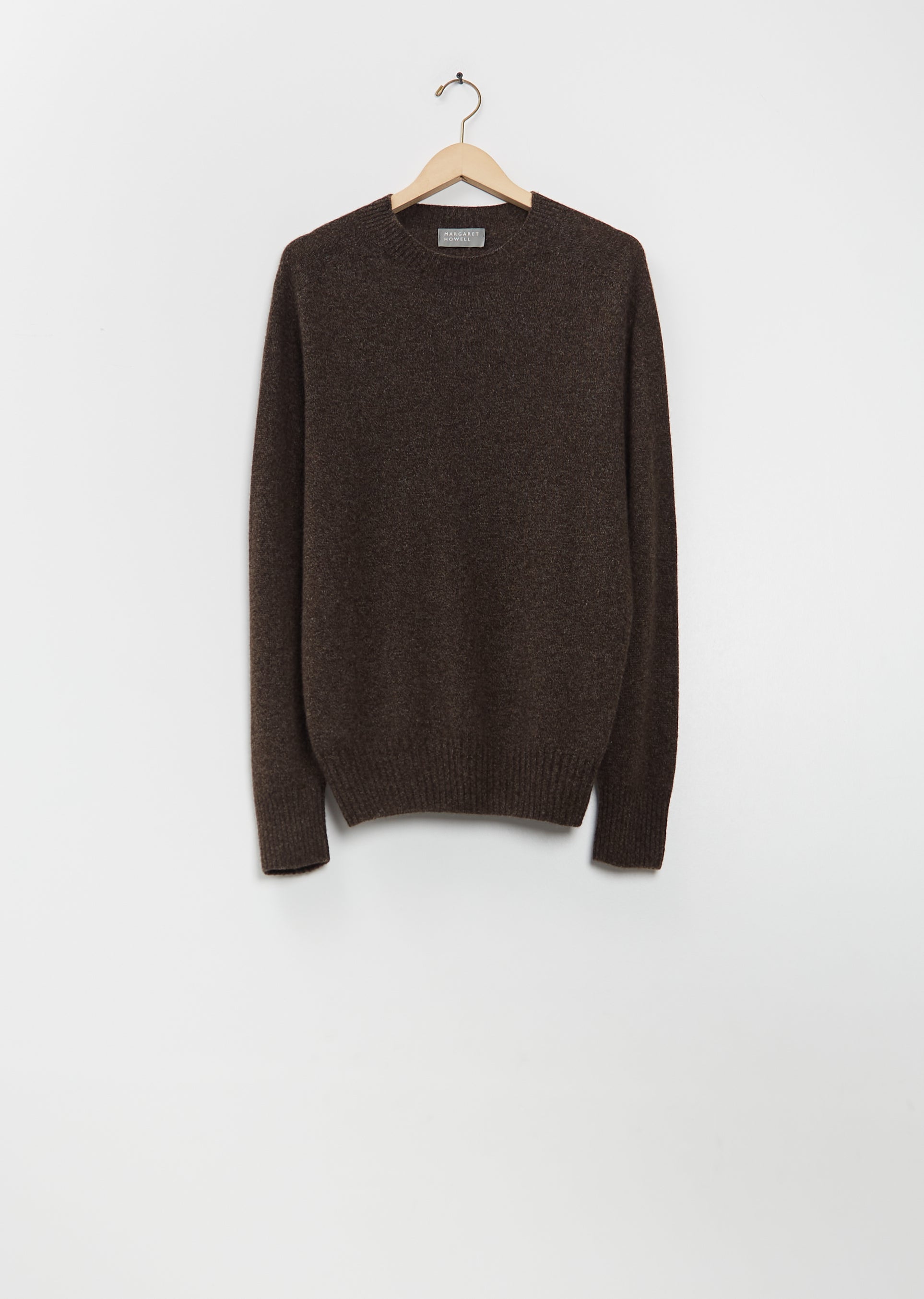 Margaret Howell coffee brown pullover sweater with a crew neckline and saddle shoulder in lightweight yak wool cashmere blend knit. Features contrasting rib trim finish at neckline, cuffs, and hem. Relaxed fit.