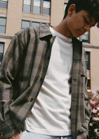 Margaret Howell black and brown herringbone overshirt with a classic collar and horn-hued button front in mid-weight cotton wool twill. Featured dropped shoulders, large chest flap patch pocket, buttoned cuffs, and two box pleats at back yoke. Relaxed fit.