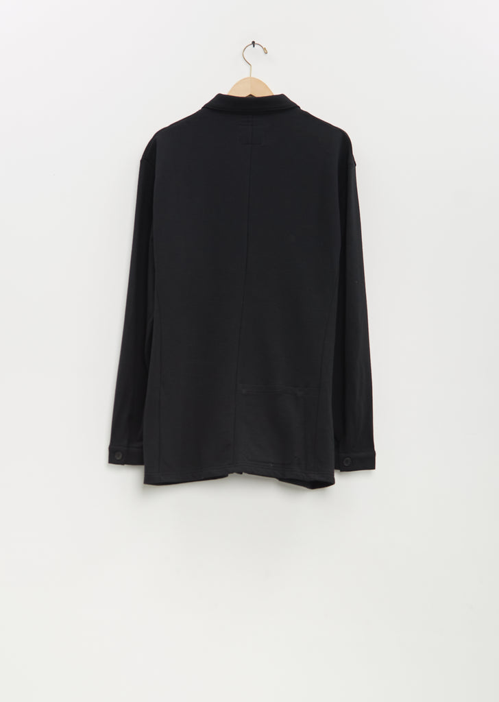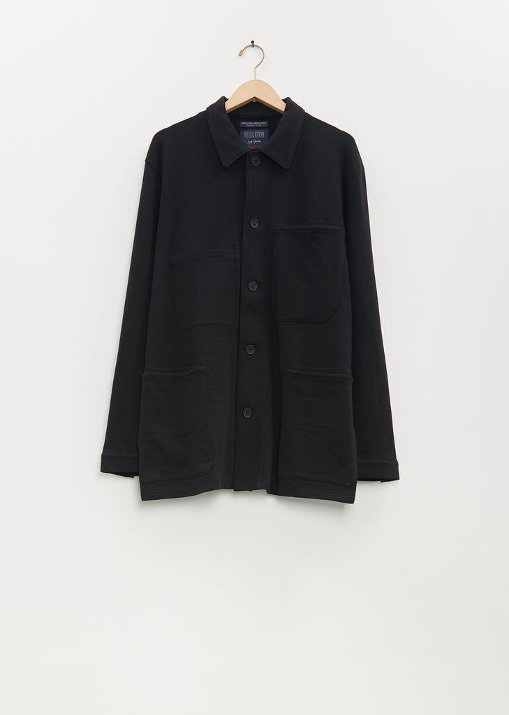 Yohji Yamamoto black shirt jacket with four patch pockets at front in mid-weight cotton. Features a classic collar, dropped shoulders and a tonal buttons closure at front.