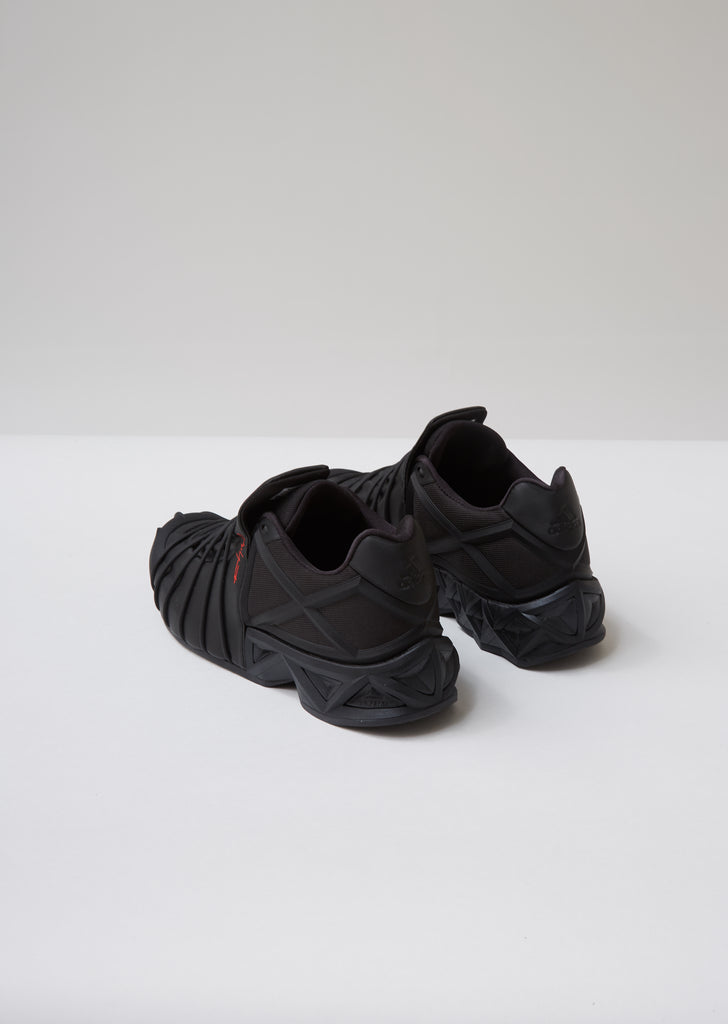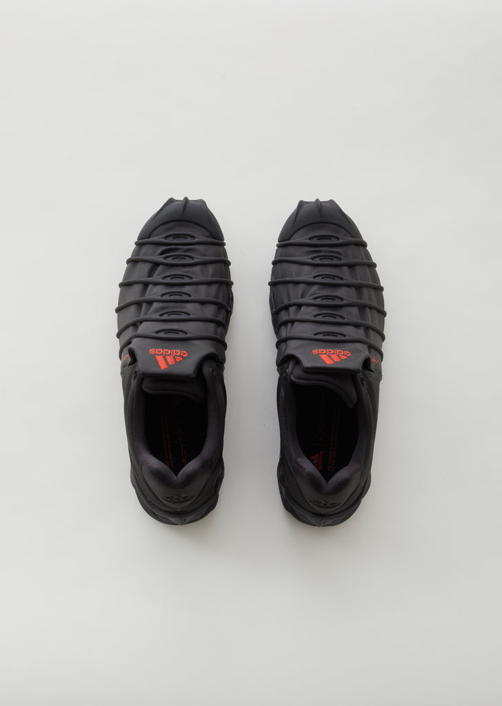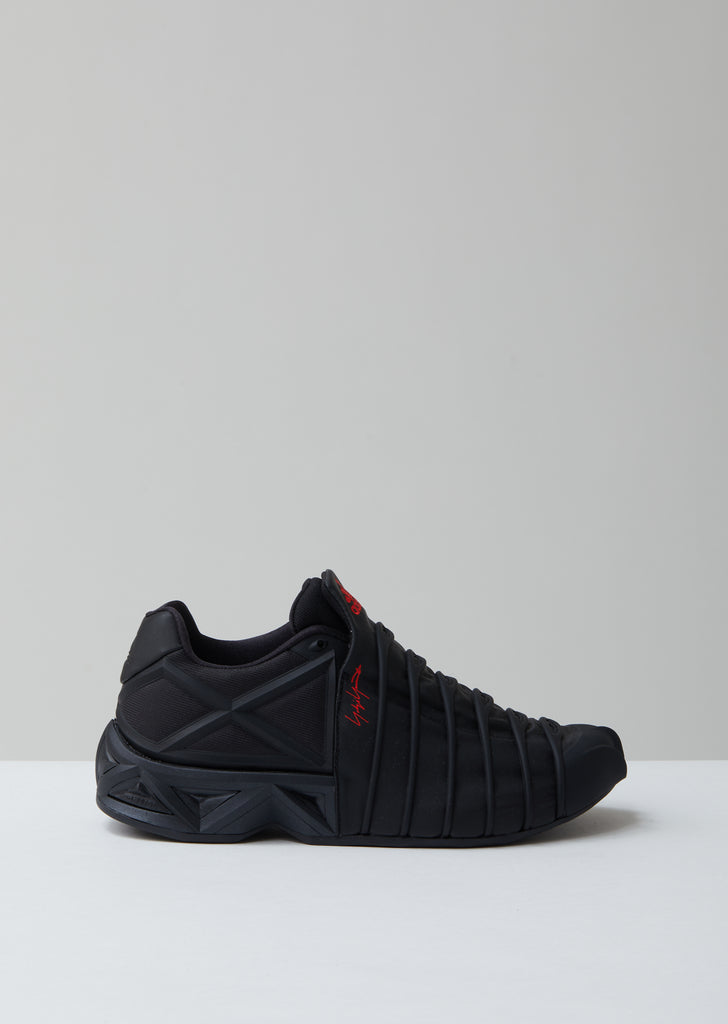 Black mixed-material slip-on sneaker enhanced with Adiprene cushioning technology at the heel and forefoot. A relaunch of an original Y-3 style dating back to the early 2000s. Tapered toe with ridged tip. Mesh-and-tech-satin upper. Rubberized bands at vamp. Layered tongue. Upper tongue is embroidered with Adidas three-stripe logo; lower is padded. Yohji Yamamoto logo at edge of quarter panel. Rubberized diamond relief patterns at middle, back, and midsole. Tonal debossed Adidas three-stripe logo on mustache. Lightweight EVA midsole. Rubber outsole. Textile lining.