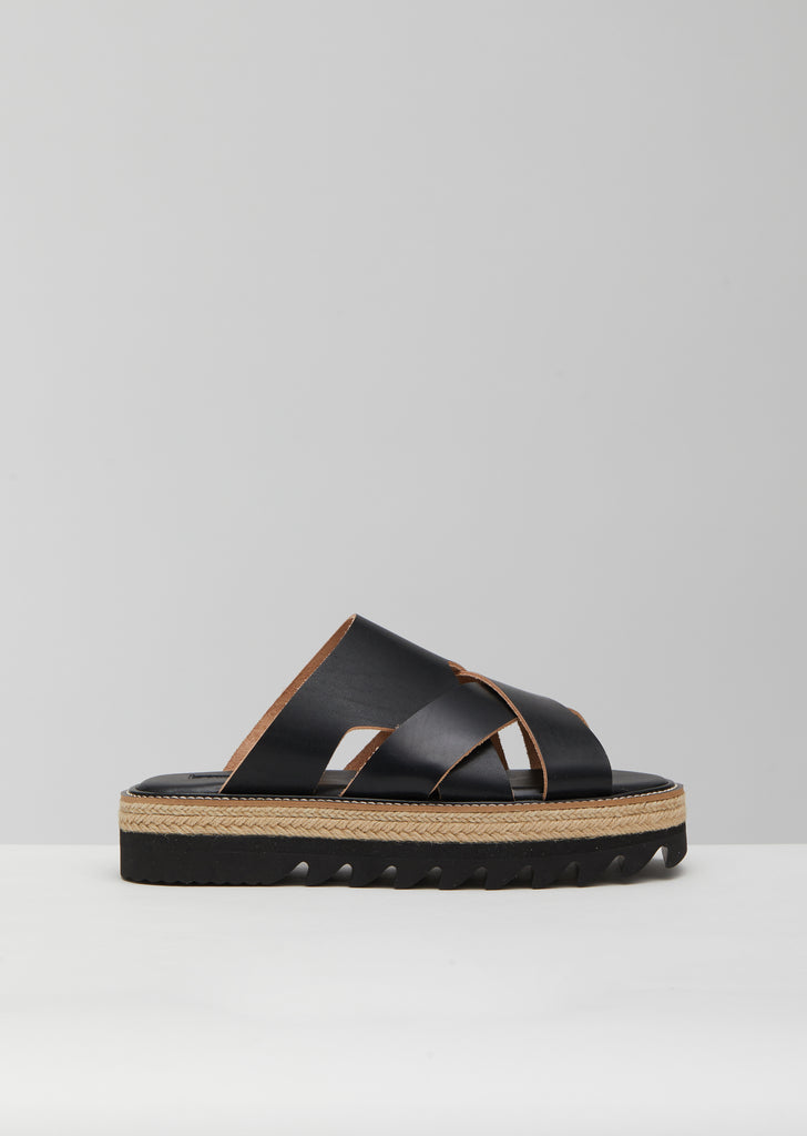 Black platform sandals in buffed leather, designed with a contrast jute-wrapped midsole and a shark-toothed rubber outsole. Imagined in collaboration with Kayo Nakamura.