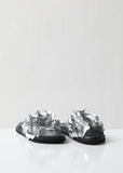 New from Zucca: Black leather slides embellished with laminated silver bouquets along the upper bands. Detailed with silver-tone polished hardware. Cushioned leather footbed with an embossed logo detail. Durable rubber treaded soles. Color: Silver. Uppers: Synthetic; Lining: 100% Leather; Sole: 100% Rubber. Imported.