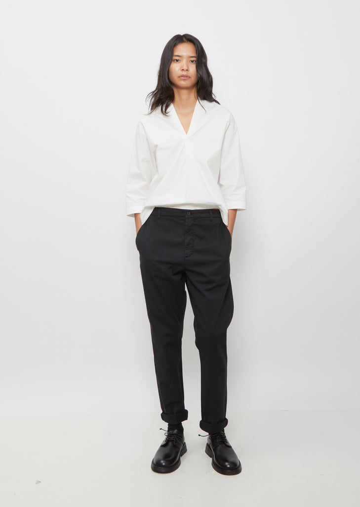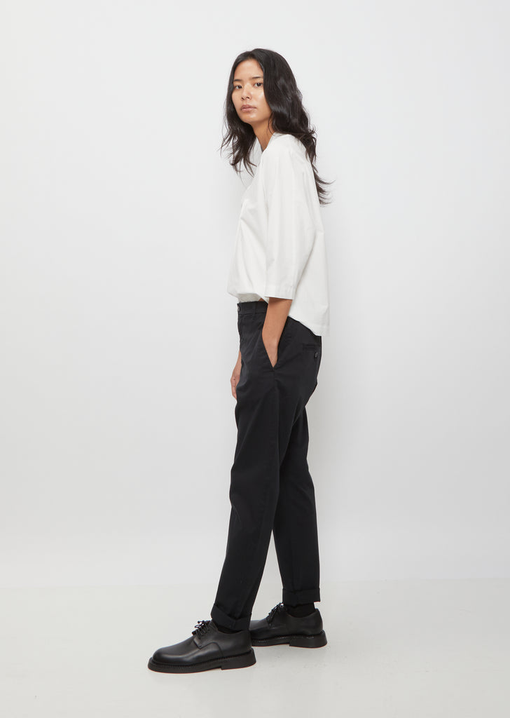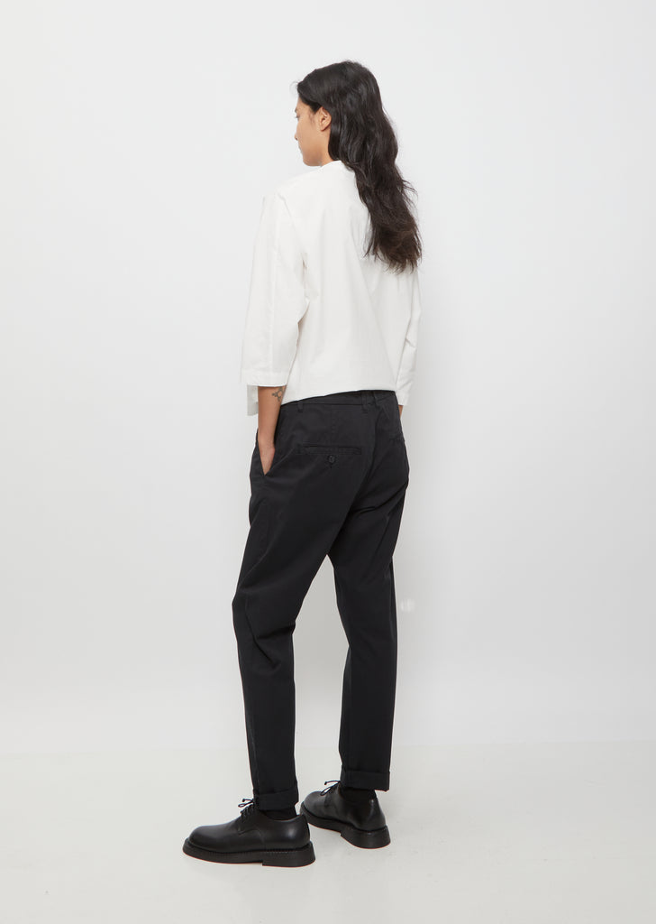 Hope News Edit Trousers in Black. The label's most popular trouser inspired by a classic chino that sits at the hip with a slouchy, tapered leg fit. Slash pockets at front and two back pockets.