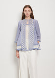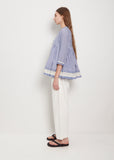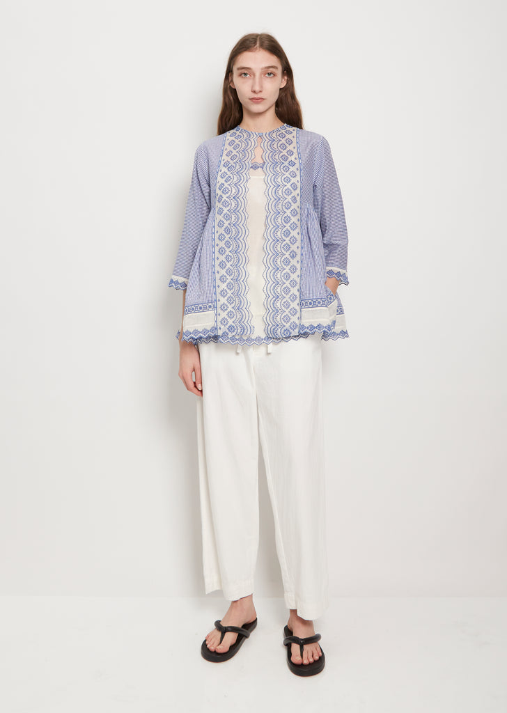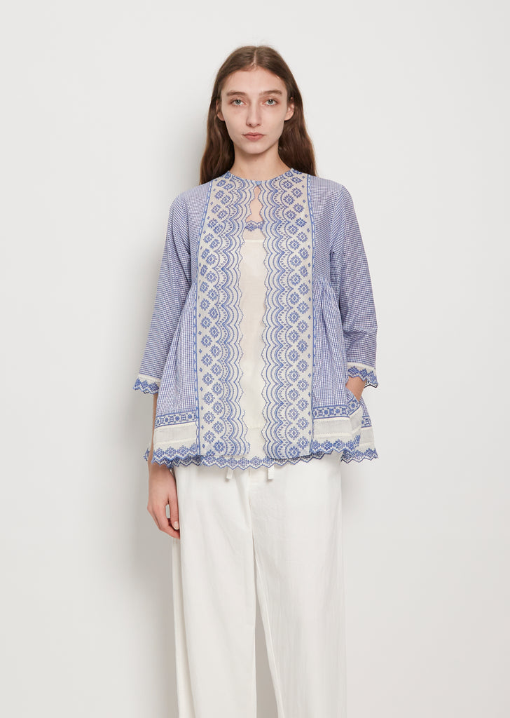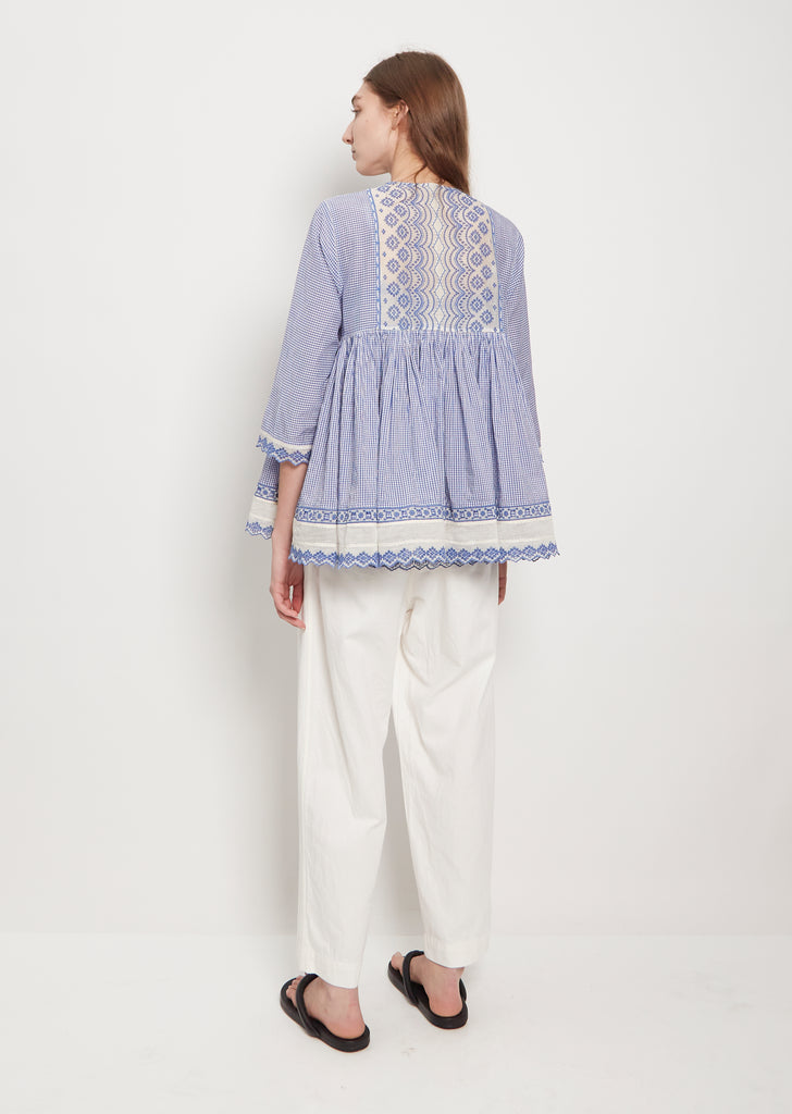 Péro blue and white mini checked scallop lace detailed top with rounded neck and single button closure. Lined with separate tank underlay in naturally dyed cotton silk organdy. Features three-quarter length sleeves, and scallop lace trim edge finish on placket, cuffs, and hem. Finished with custom buttons. Can be worn separately.