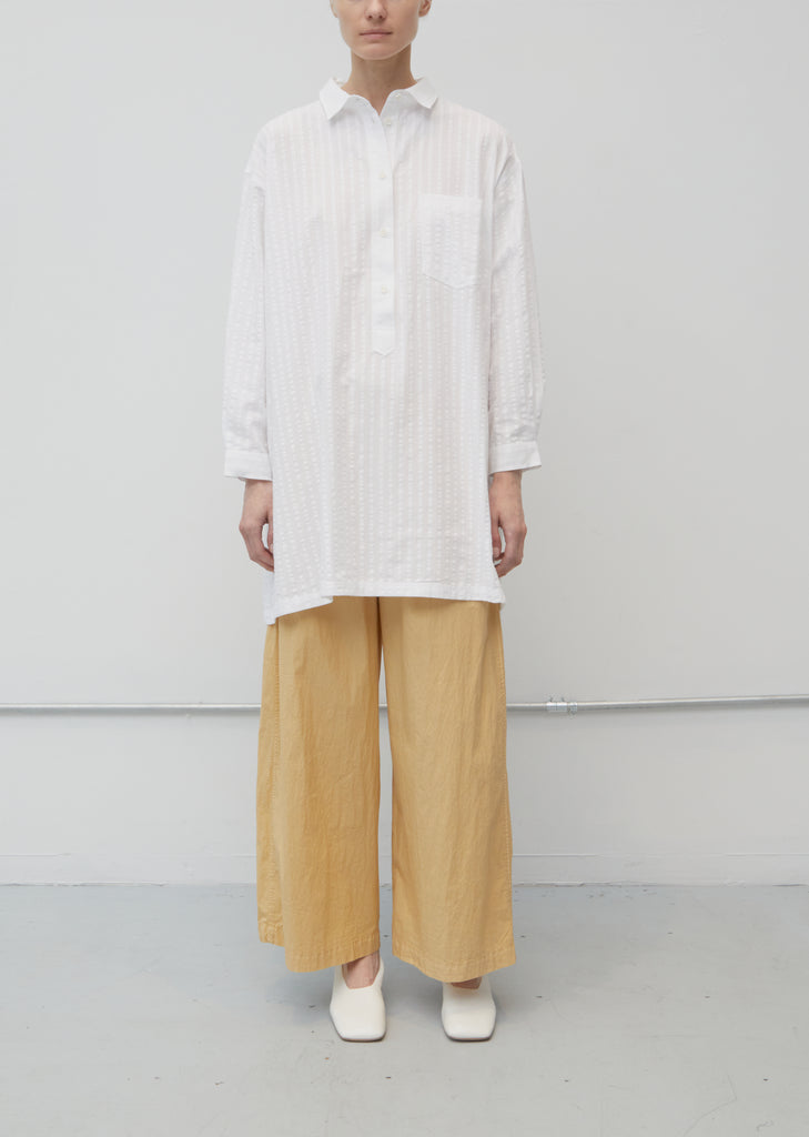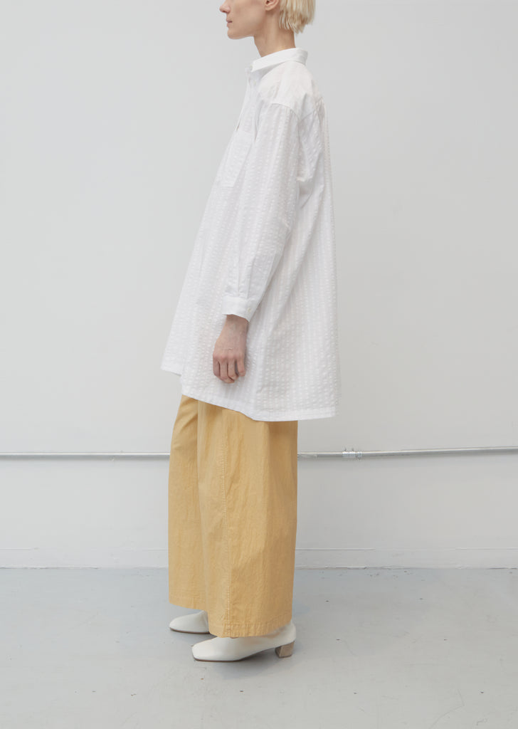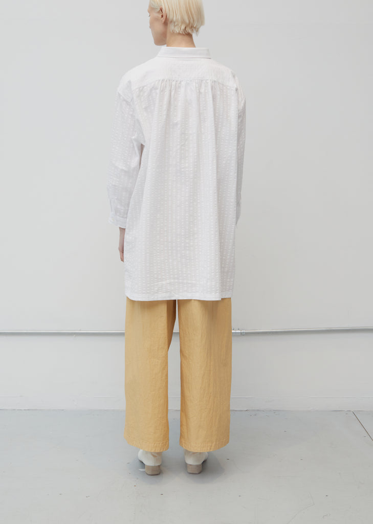 Henrik Vibskov signature popover long shirt in organic cotton seersucker with tonal white vertical stripes. Features a buttoned front on a half placket with single chest pocket at left. Full length sleeves with buttoned cuffs and pleat detailing. Back yoke with gathers. Easy, relaxed fit.