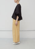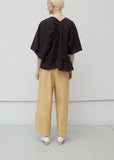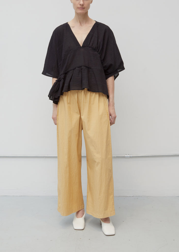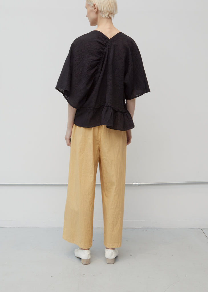 Henrik Vibskov paneled popover blouse in black cotton with a hint of stretch. Features a V-neckline and front and back, wide dolman sleeves, and ruffle hem.
