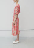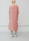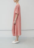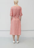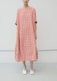 Henrik Vibskov paneled tunic dress with an optional self belt in pink and white linen check. Features a boat neckline and long short sleeves. Tunic silhouette with a soft balloon hem. Pops over. Unlined.