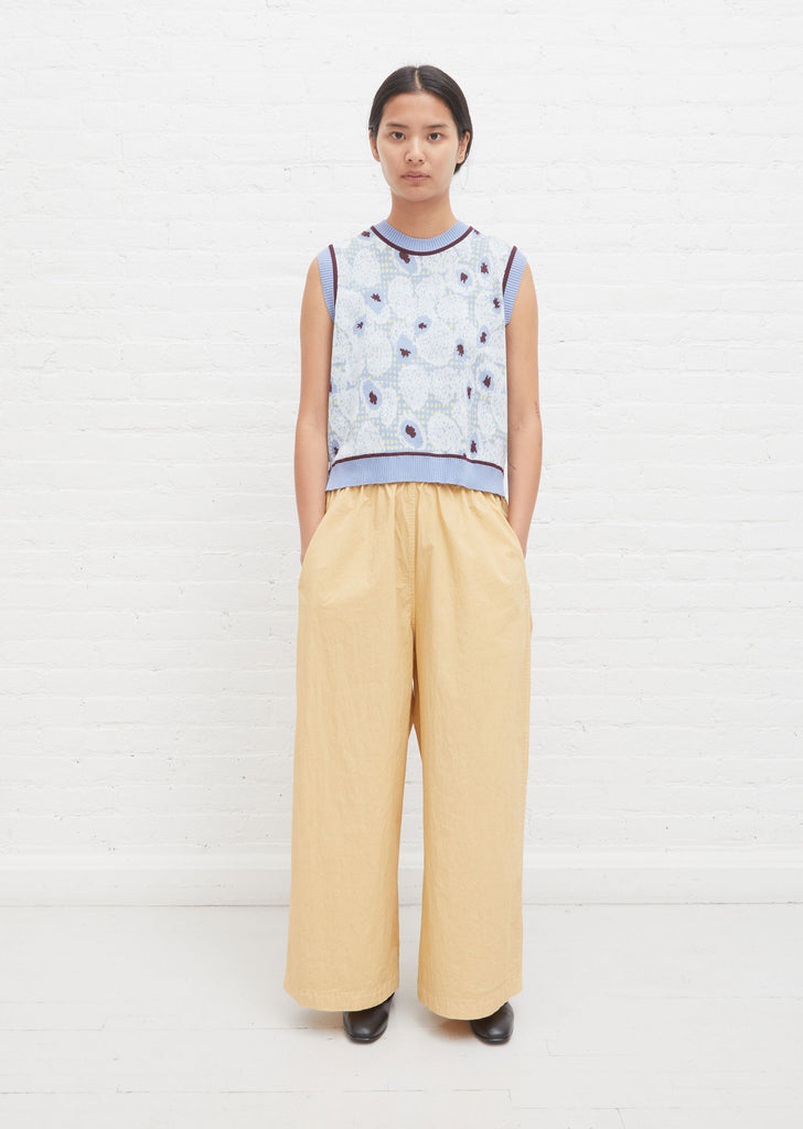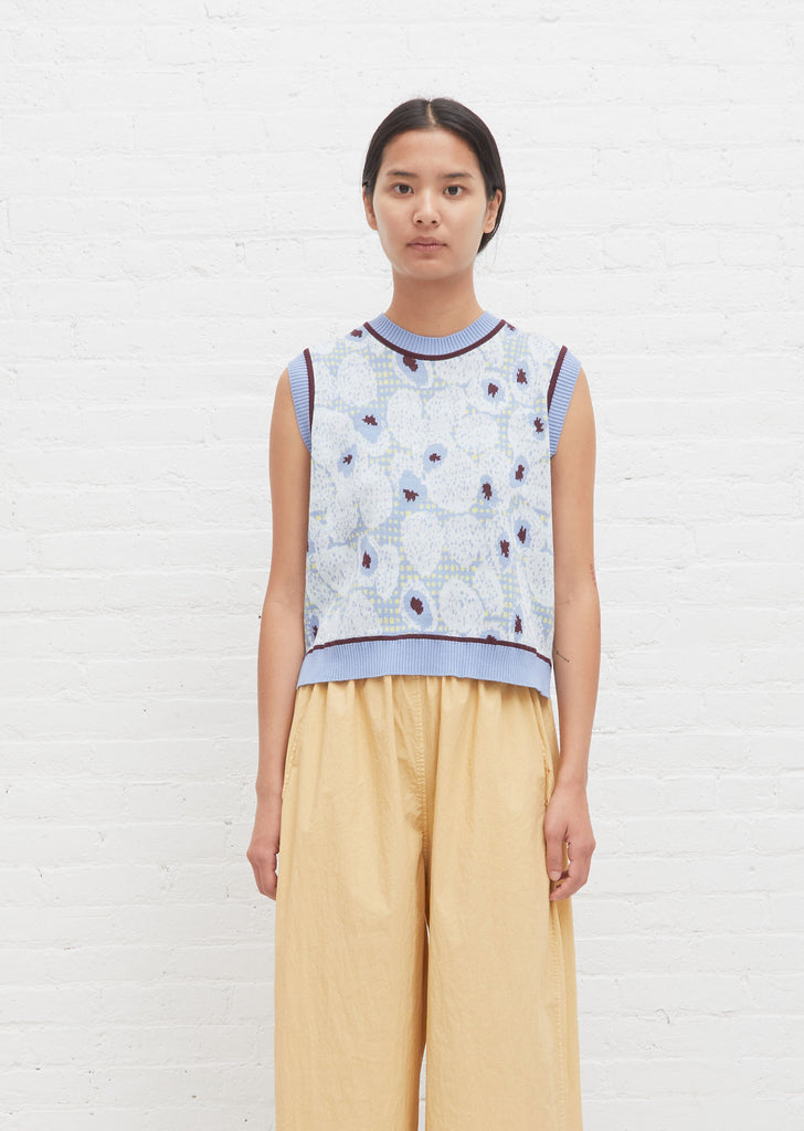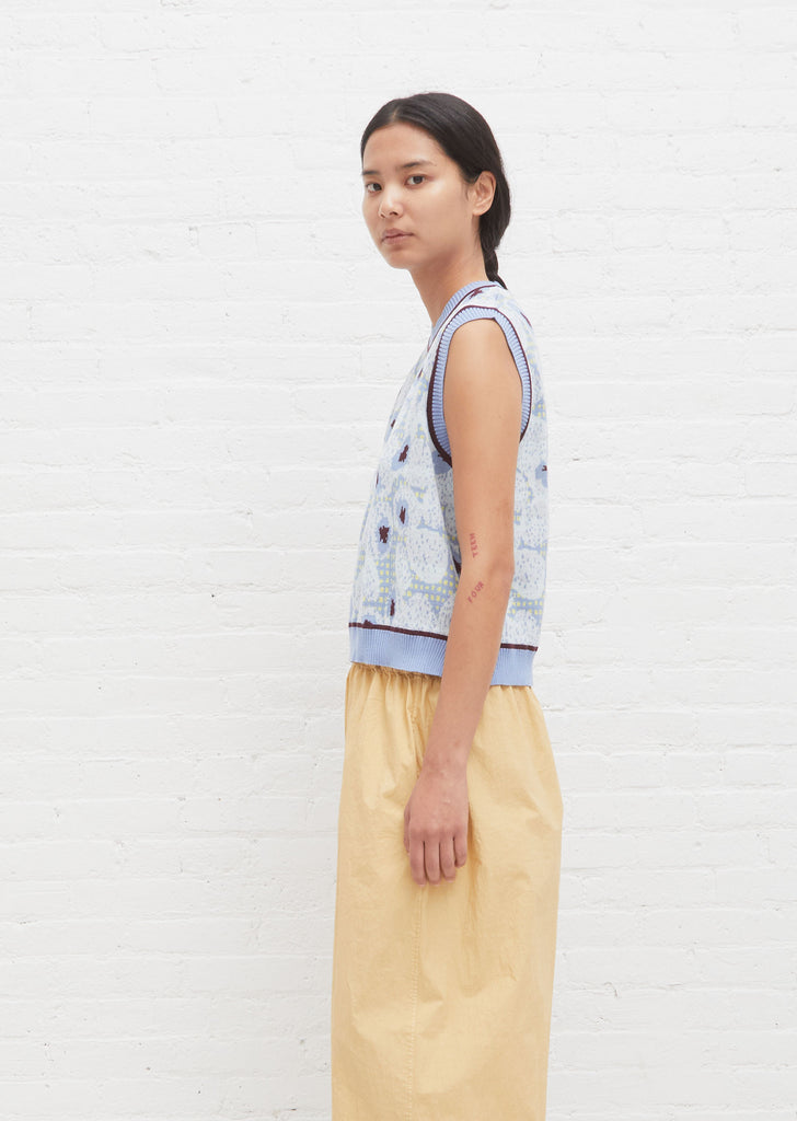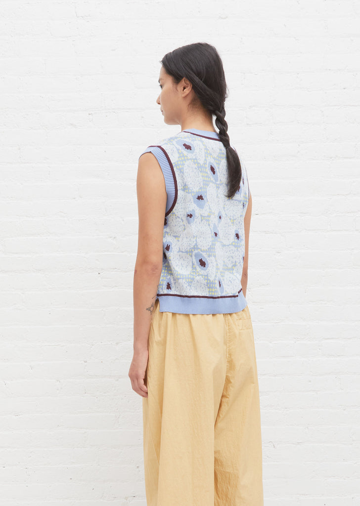 Henrik Vibskov crewneck sweater vest with blue, pale green and white tone 'mint blueberries' print knitted from organic cotton. Ribbed neckline, armholes and hem in solid sky blue with dark brown trim.