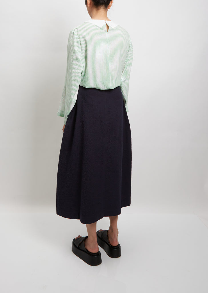 Henrik Vibscov navy a-line midi skirt in a stretch cotton sear sucker.