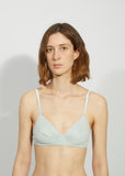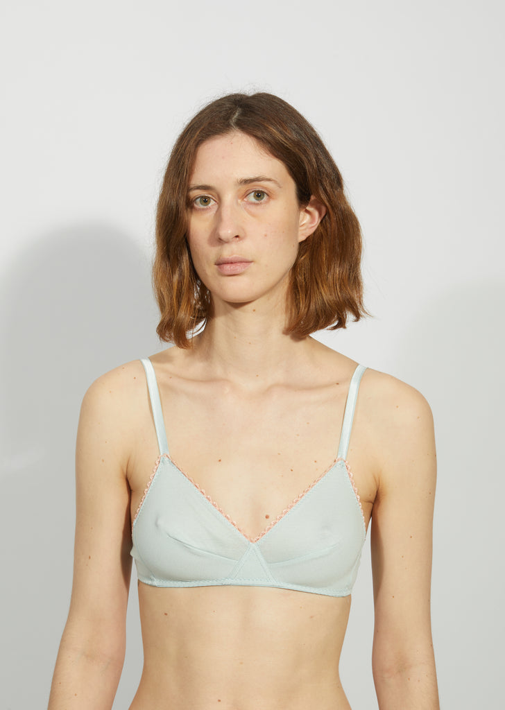 Powder-blue soft-cup triangle bralette in ribbed cotton jersey, featuring flat adjustable shoulder straps and pink crochet trim.