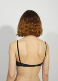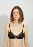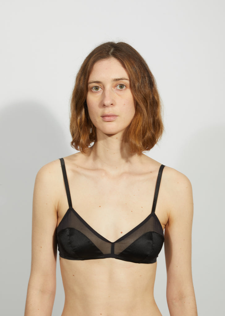 Black silk-chiffon bralette with darted silk-charmeuse soft-cup inserts and fully adjustable shoulder straps.