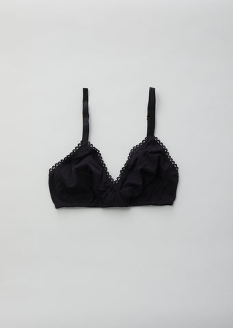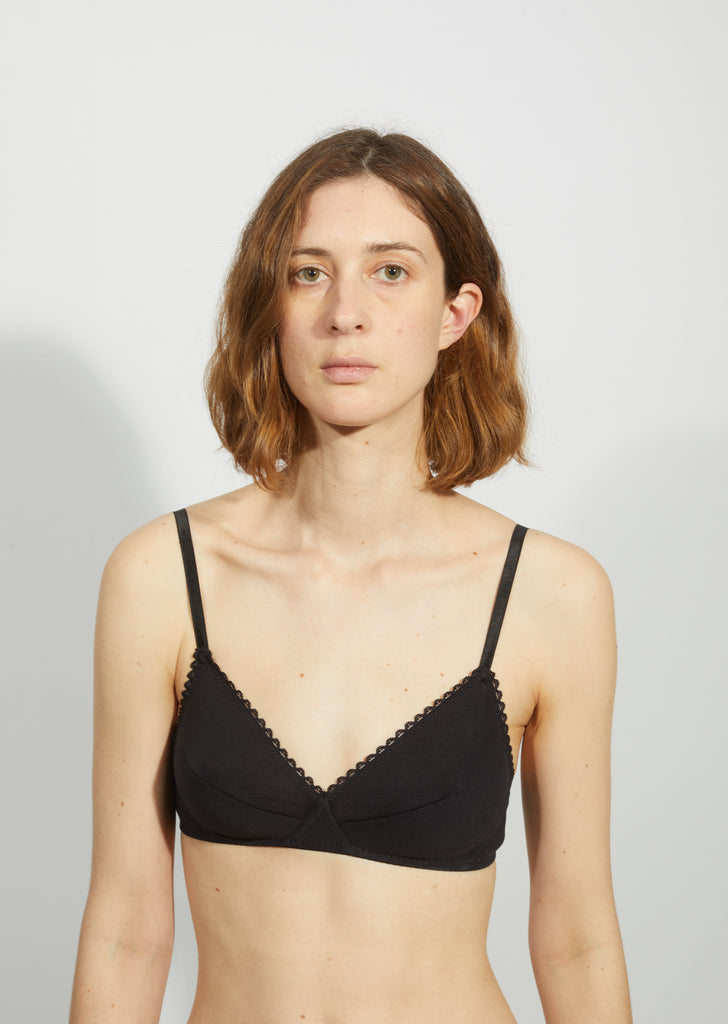 Powder-blue soft-cup triangle bralette in ribbed cotton jersey, featuring flat adjustable shoulder straps and tonal crochet trim.