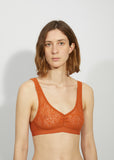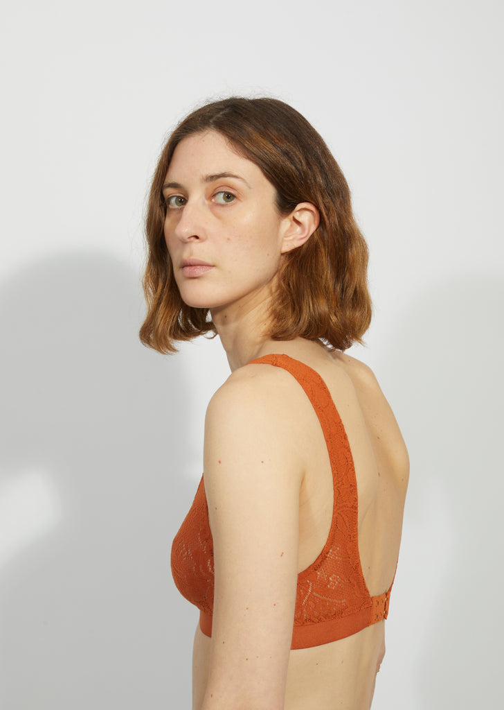Terracotta-colored wireless bralette in stretch French lace with floral motifs, featuring wide shoulder straps, a U-neckline, and subtle ruching at the bust.
