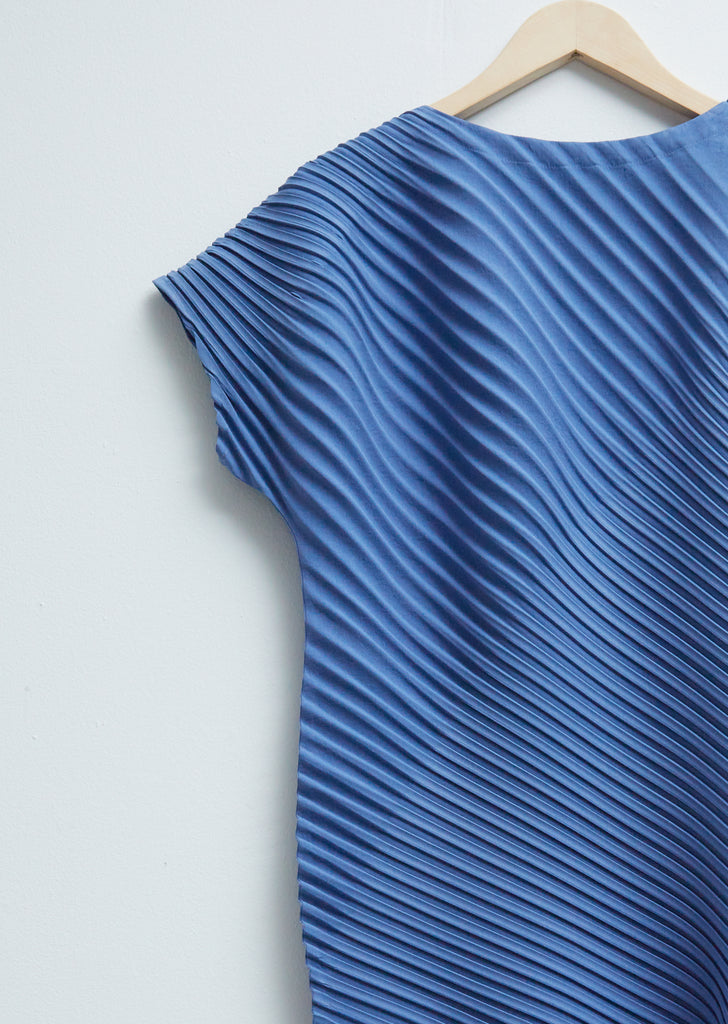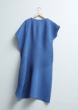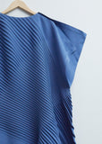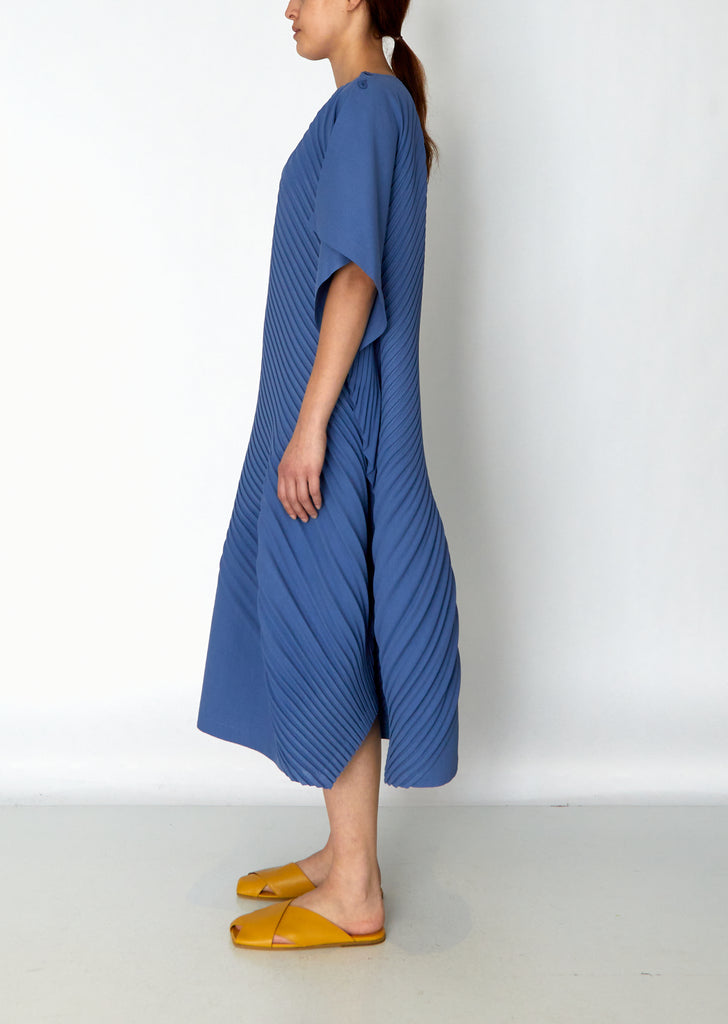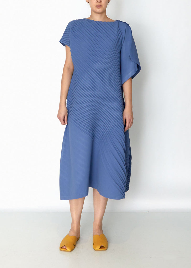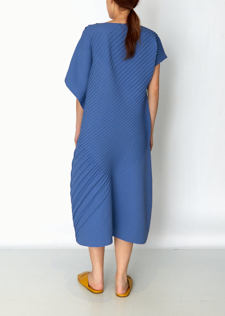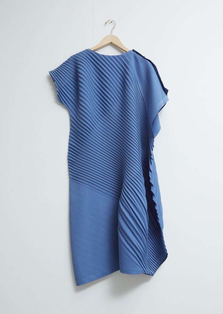 Issey Miyake sculptural asymmetric pleated dress in a dusty blue crafted in technical crepe. This pleated dress has a wide, asymmetrical shape, including one draped sleeve secured with two tonal buttons on the shoulder. Relaxed fit with an asymmetrical hemline.