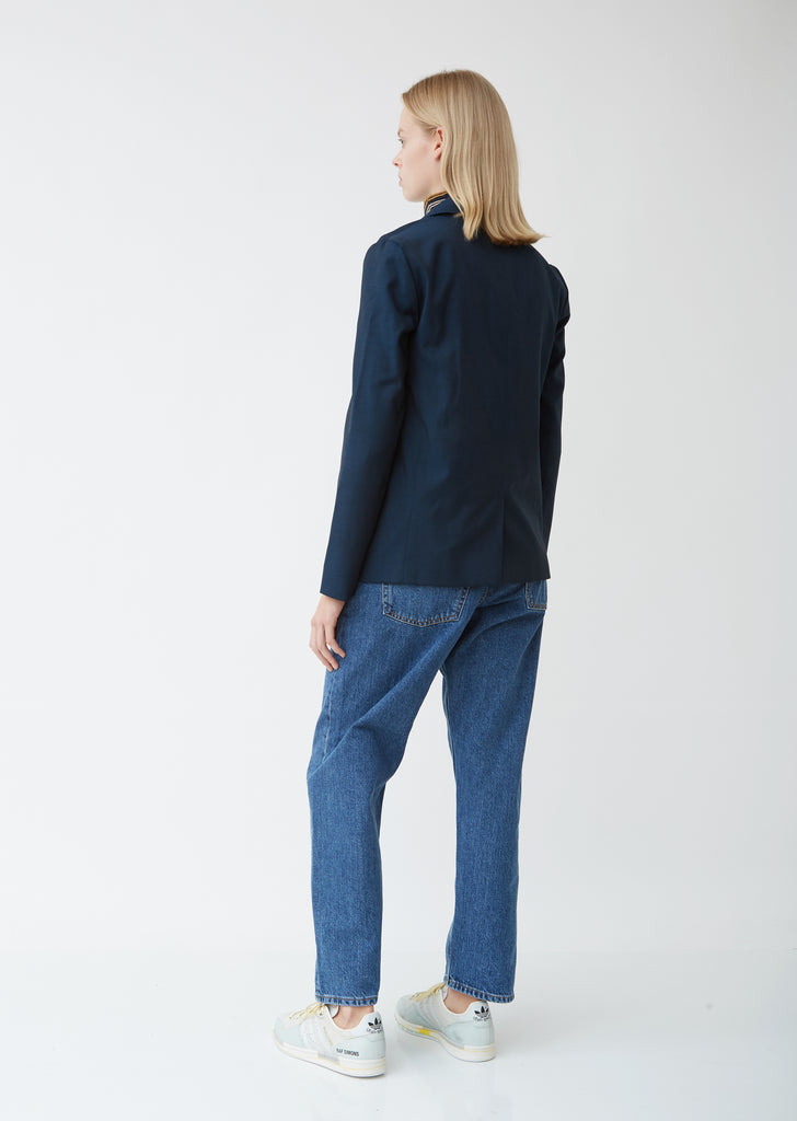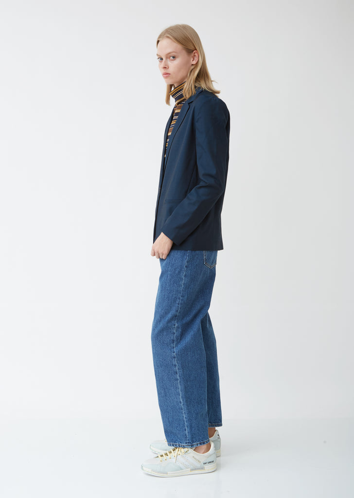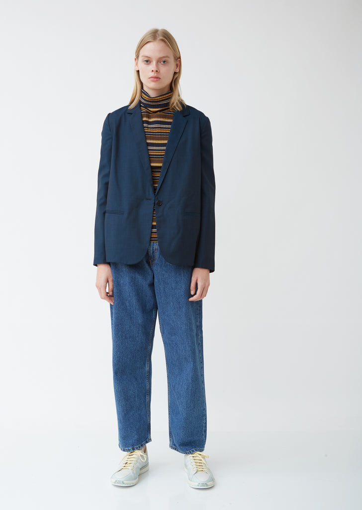 A boyish, straight-fit blazer in wrinkle-resistant sharkskin from 6397, a reflection of the practical wardrobe of New York-based designer Stella Ishii. Single-breasted. Single-button front closure. Notch lapel. Two front welt pockets. Color: Blue. 100% Extra Fine Merino. Dry clean only. Made in the United States.