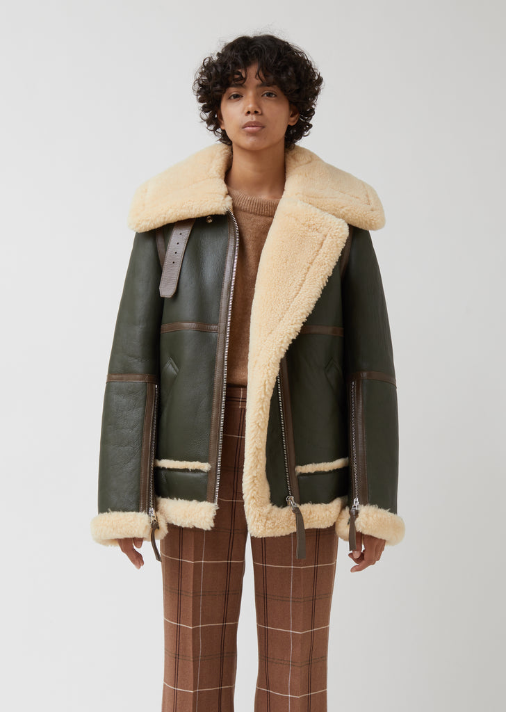 Hunter-green lamb-shearling jacket featuring contrast brown calfskin trim, an oversized pin-buckled spread collar, and metallic zip details. Long sleeves. Zippered sleeve vents. Angled welted side pockets. Zip front. Adjustable pin-buckle straps at sides. Straight hem falls to upper thigh. Straight, relaxed fit.