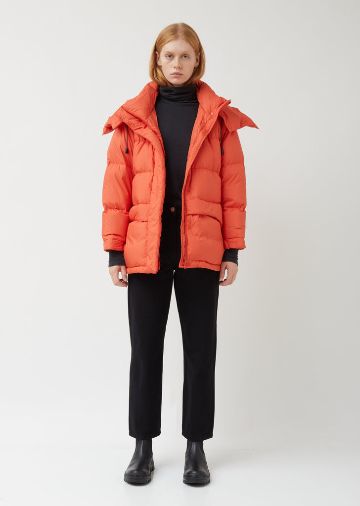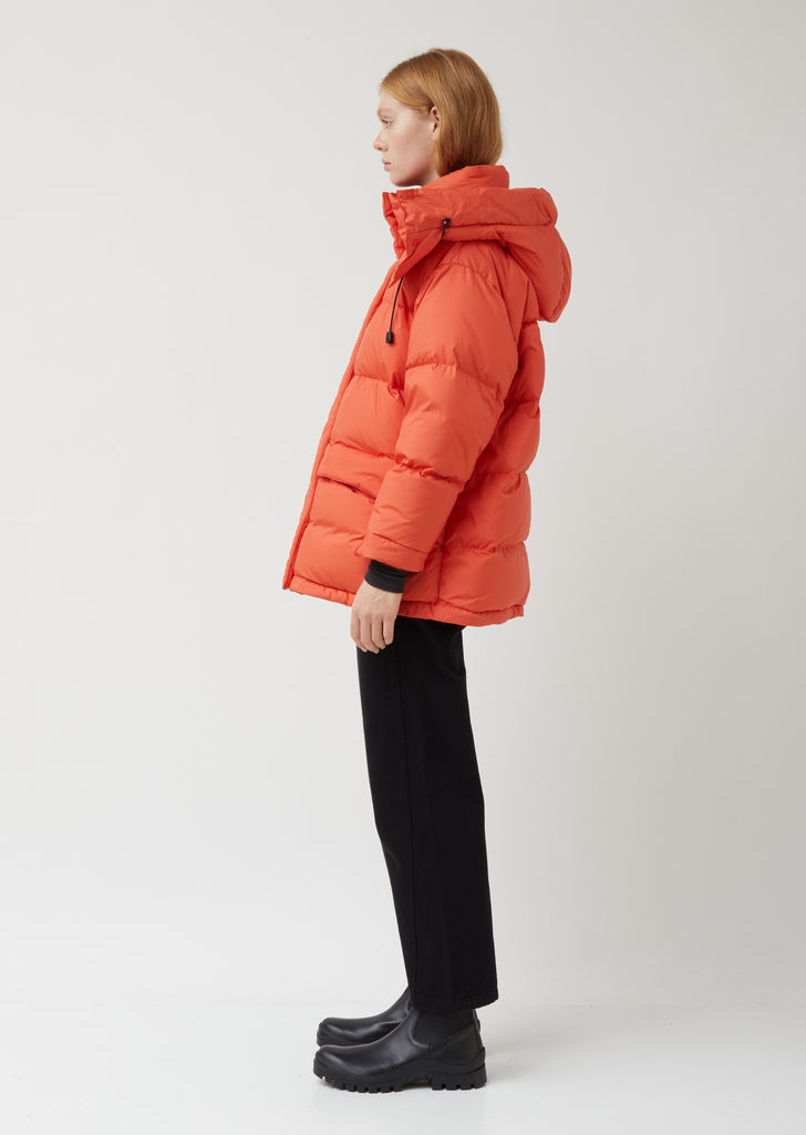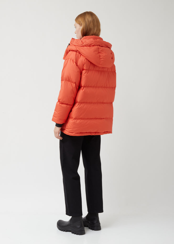 Down-quilted puffer jacket in orange microfiber, featuring an adjustable hood and concealed front fastening. High stand collar; tonal cased drawstring with toggle adjusters. Long sleeves. Concealed two-way-zip and snap-button front fastening. Slip pockets at hips. Straight hem falls to lower hip. Straight fit.