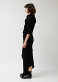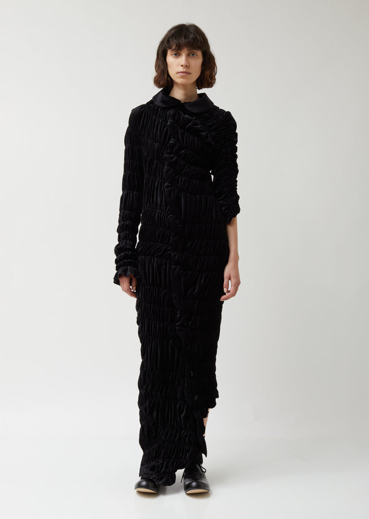 Maxi-length shirtdress crafted from irregularly shirred rows of plush black tech-velour, finished with a silk-satin Peter Pan collar, asymmetric full-length button-front closure, and asymmetric sleeves. 3/4-length sleeve at right; long sleeve at left. Tonal buttons. Angled asymmetric hem is floor-length at right side, calf-length at left side. Loosely fitted column silhouette.