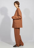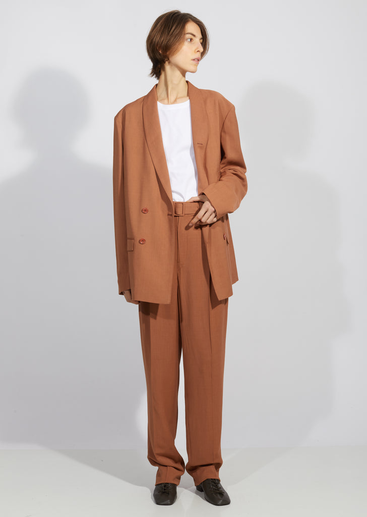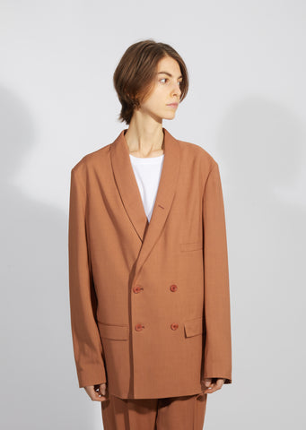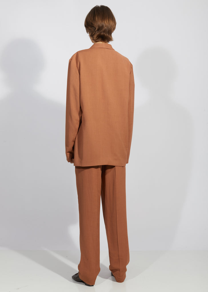 Copper brown blazer with shawl lapels, a double-breasted front button fastening, a slit pocket at the chest, flap pockets at the front and an interior slit pocket.