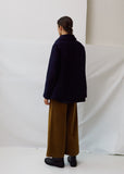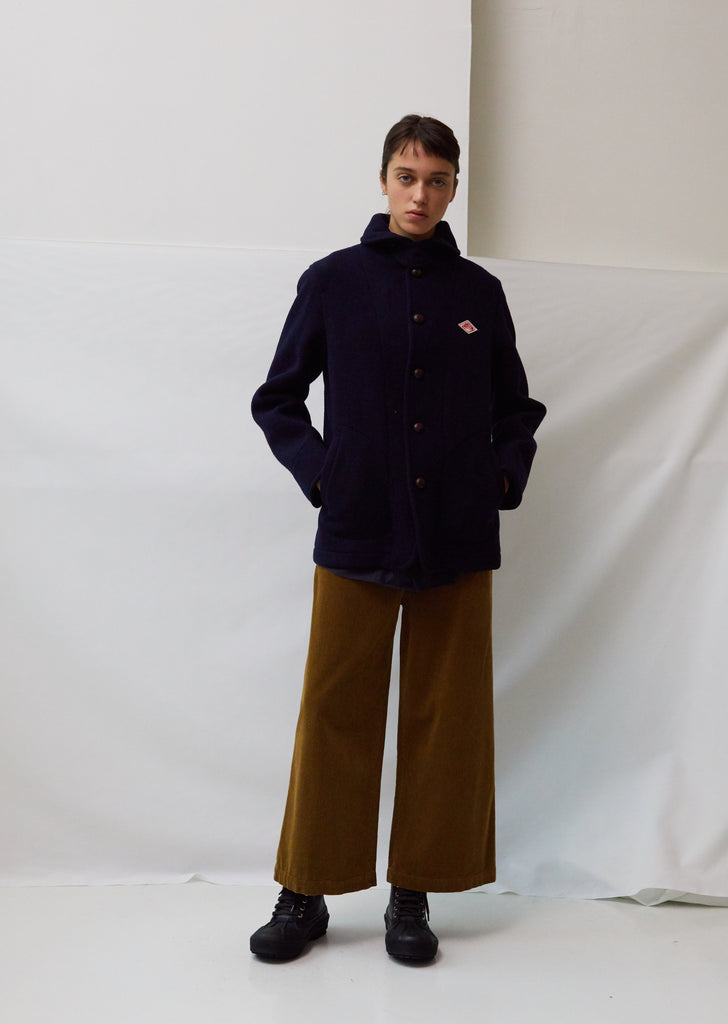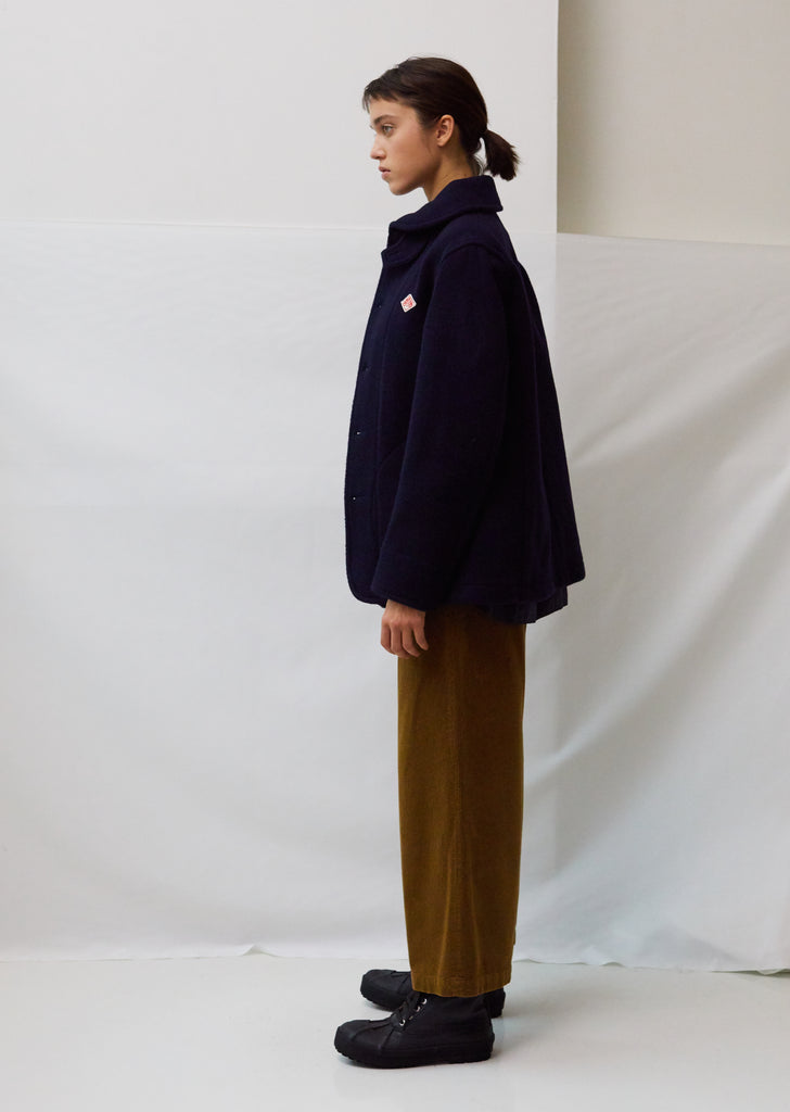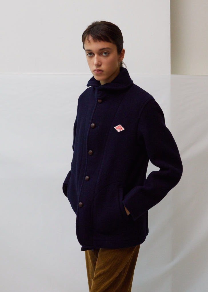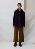 Unisex single-breasted jacket cut from navy brushed wool melton. Paneled construction. Cutaway club collar. Single-button throat latch. Long sleeves. Button placket. Brown cowhide knot buttons. Red-and-white embroidered logo patch at chest. Viennese seams at back. Angled welt front pockets. Split half-moon yoke at nape. Straight hem falls to upper thigh. Straight, relaxed fit.