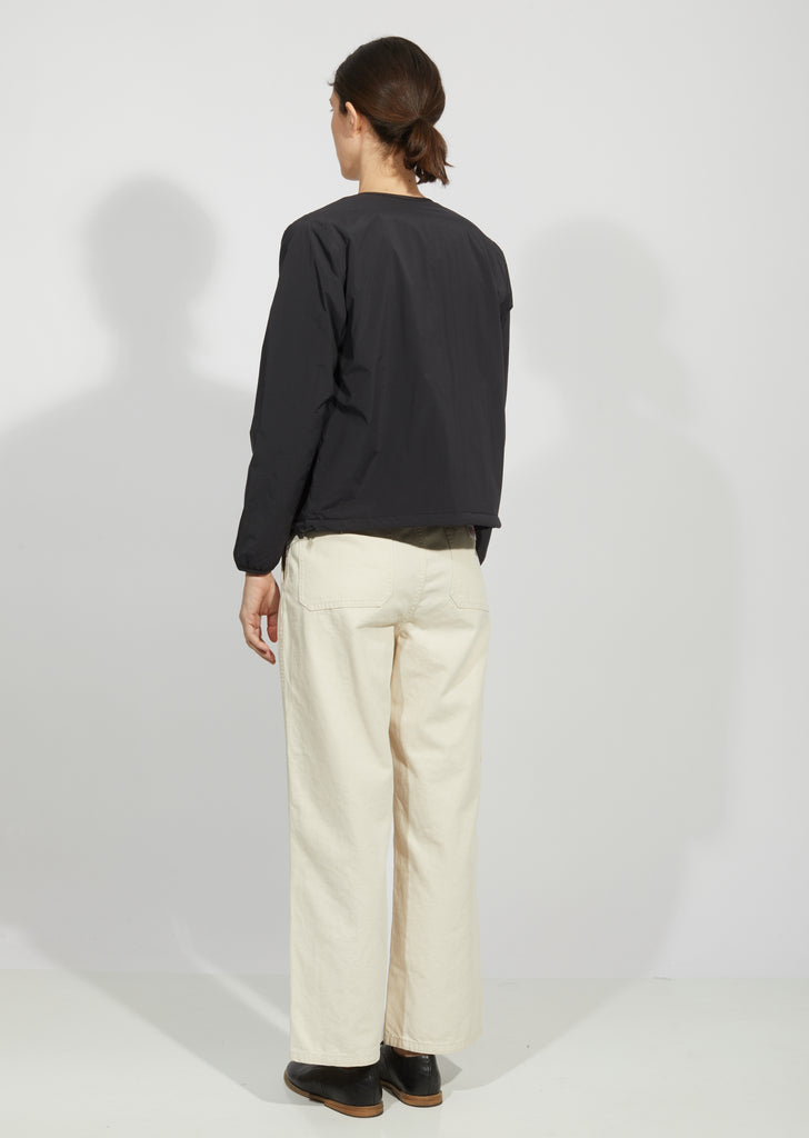 • round neckline; long set-in sleeves; angled zip welt side pockets