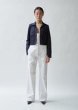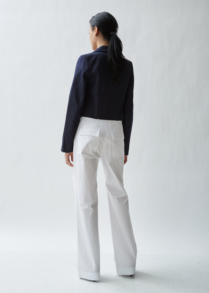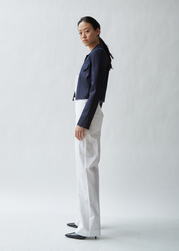 Raw denim cropped denim jacket from Gabriela Coll Garments. Detailed with two chest pockets, split sleeve cuffs, and a classic pointed collar. Made for an authentic, unwashed raw denim feel that will fade and stretch with wear, resulting in a truly personalized piece. Color: Blue. 100% Raw Denim. Handmade in Spain.