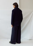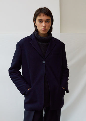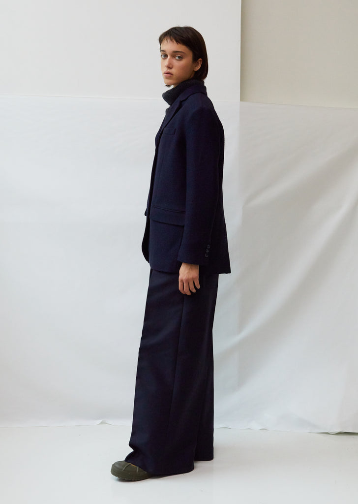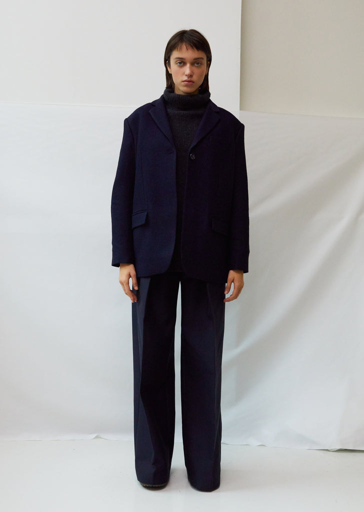 Relaxed-fit single-breasted blazer crafted of deep-navy virgin-wool-blend twill. Notch lapels. Slightly dropped shoulders. Long sleeves. Three stacked buttons at sleeve vents. Single-button closure at upper chest. Darting at front waist. Stand chest pocket. Flap besom front pockets. Center vent at back hem. Straight hem. Straight, relaxed fit.