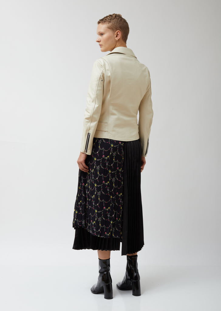 Fitted belted biker jacket crafted from cream-tone calf leather, finished with a variety of zipper stylings. Notched collar with metal studs. Long sleeves. Zippered cuffs. Asymmetric, contrast-tone zip-front closure. Zippered double-welt pockets at chest and waist. Additional snap-button flap pocket at waist. Attached pin-buckled belt at low waist. Belt loops. Brushed silver-tone metal hardware. Gently sloped back hem. Hip length. Fitted silhouette. Cupro lining.
