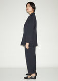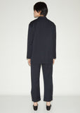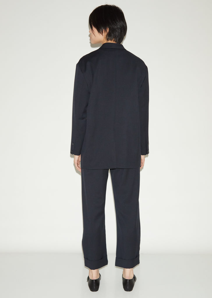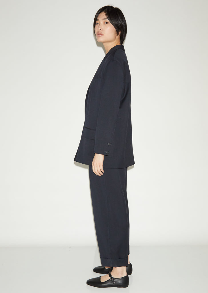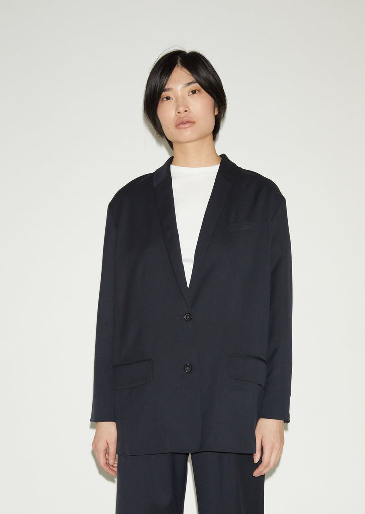Single-breasted shawl-lapel blazer cut from navy worsted lambswool. Drop shoulders. Long set-in sleeves. Two-button sleeve vents. Two-button front closure. Tonal buttons. Flap besom front pockets. Center vent at back hem. Straight hem skims upper hip. Straight, slightly boxy fit.