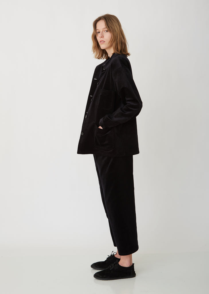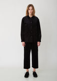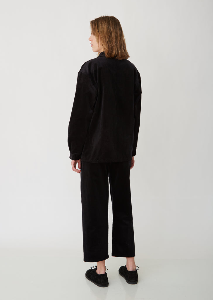 La Garçonne Moderne's signature Work Jacket updated in black corduroy. Made in New York with a loose, slightly boxy fit. Slightly square collar and button closures in front. Three patch pockets in front. Pleated button cuffs. Unlined. Color: Black. 98% Cotton, 2% Lycra. Fabric from UK. Made in New York.