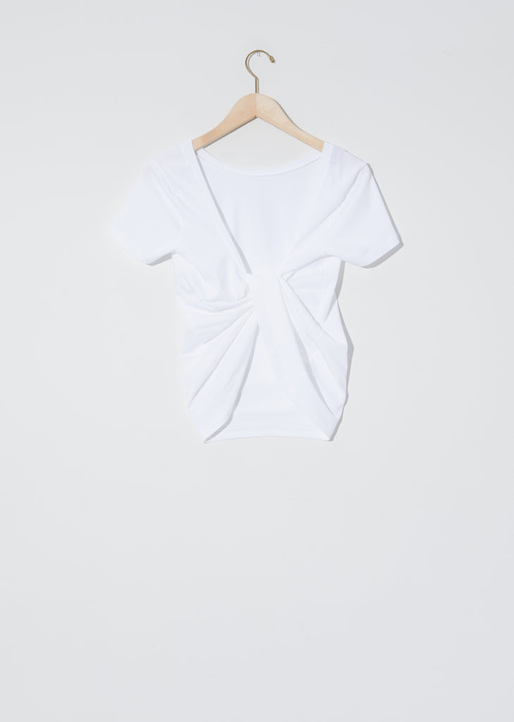 Jacquemus Le T-Shirt Sprezza in Off White. A new update to the label's signature slim tee, with a boat neckline and twisted back detail.