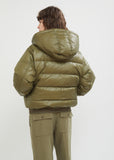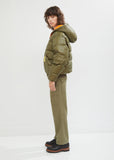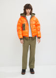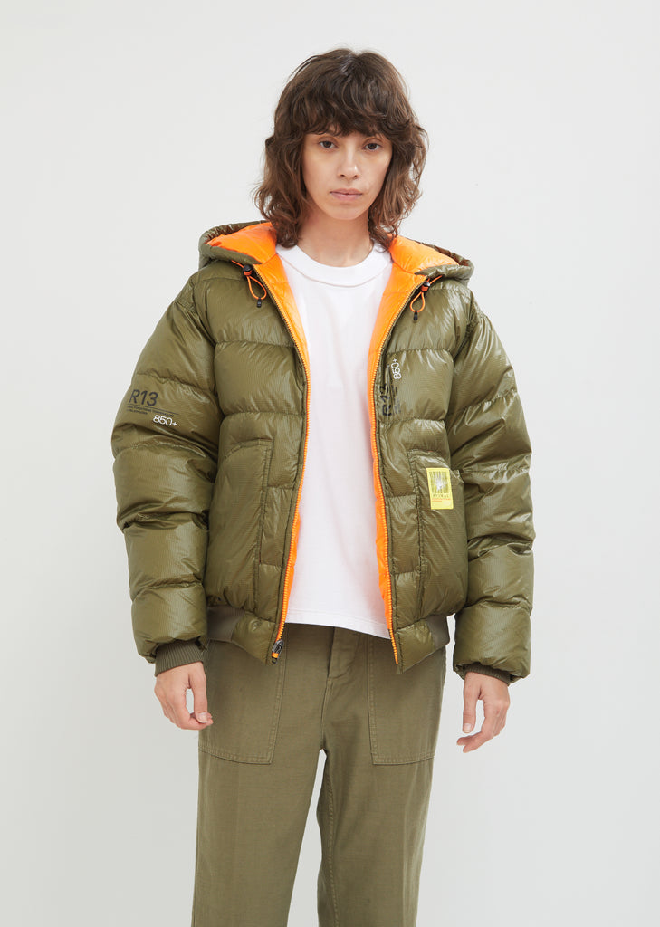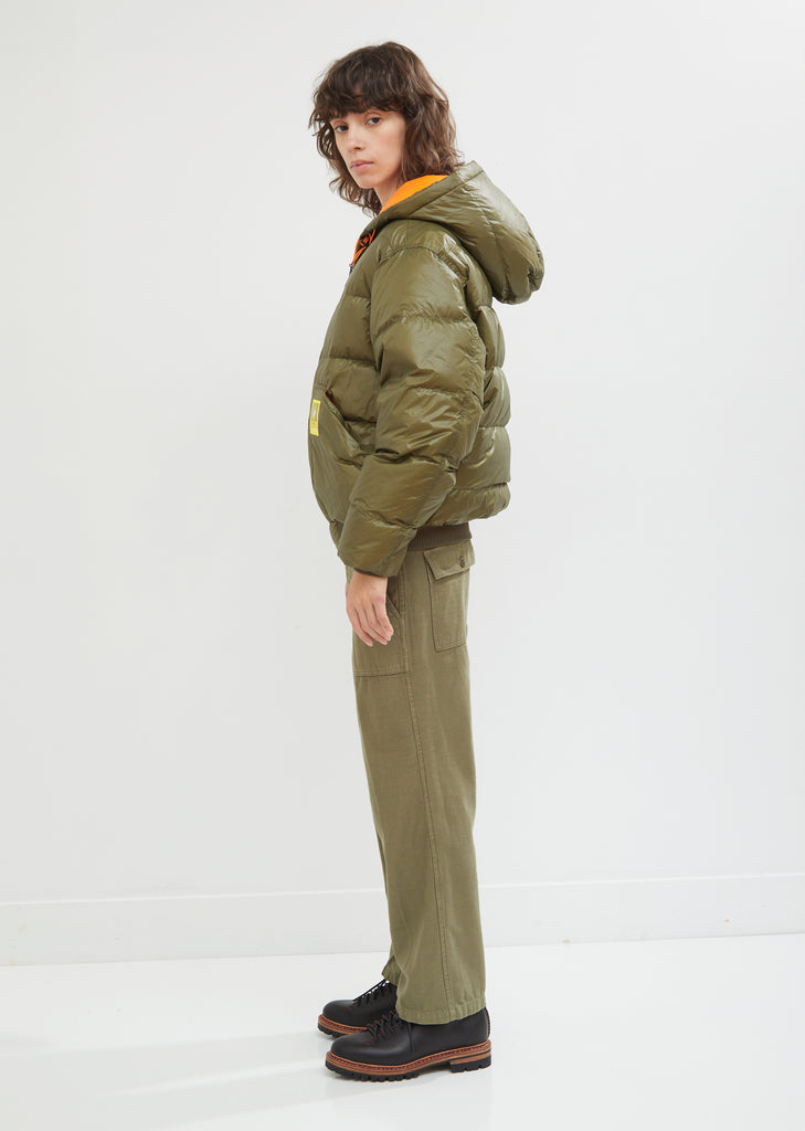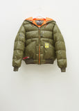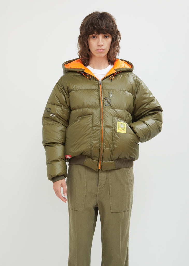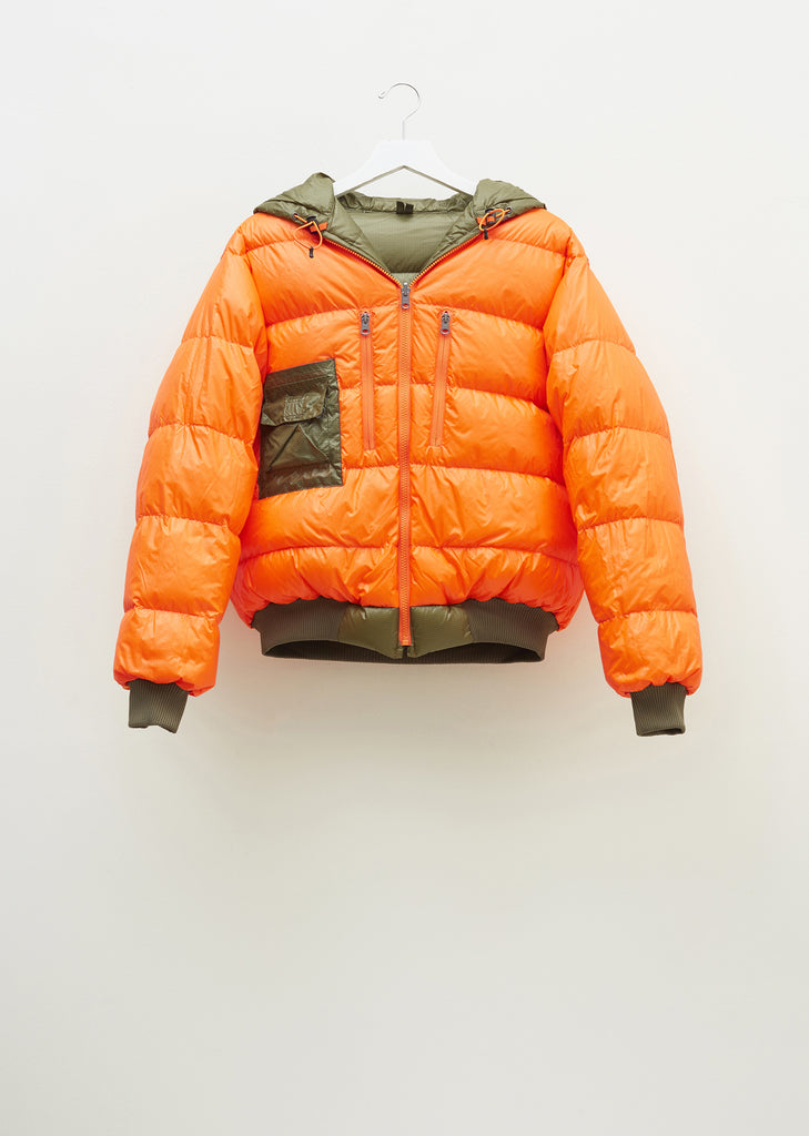 From the runway collection: Olive and orange padded down jacket with an oversized hoodie silhouette. This reversible piece features a zipper front closure and toggle drawstring cords at the hood, with sewn-in patch accents throughout. Exposed zippered pockets add utility, along with slip pocketing in front. Finished with rib knit trim at the cuffs and hem. Color: Olive/Orange. Shell: 100% Nylon; Lining: 100% Nylon; Fill: 90% Goose Down/10% Feather. Imported.