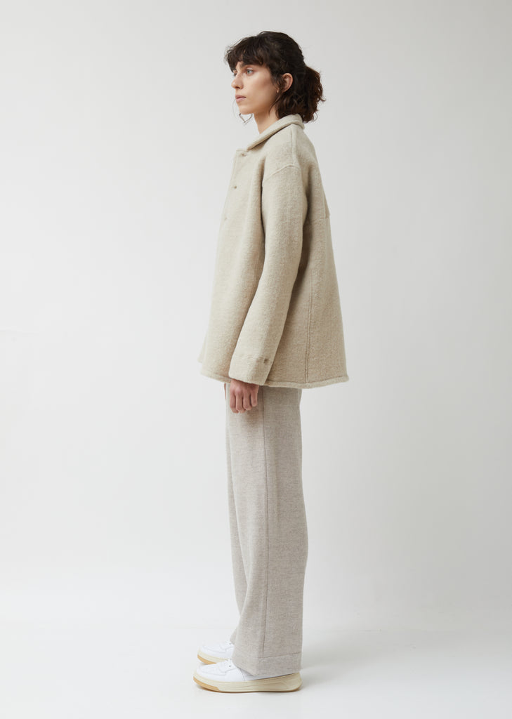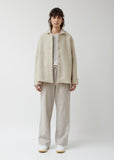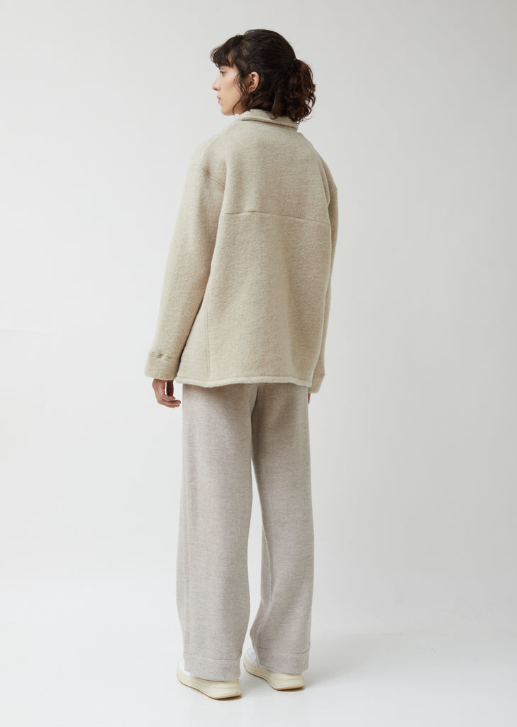 Unisex shirt-style jacket in light-grey felted lambswool, finished with paneled sides and flat-fell seams throughout. Spread collar. Long sleeves. Button-front closure. Cream-tone buttons. Deep back yoke. Straight hem skims upper thigh. Straight, relaxed fit.