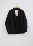 Toogood Editor Jacket in Flint (black). The British label's interpretation of the classic tailored blazer, is a single-breasted straight cut jacket in a refined linen & viscose blend with a seamless notch collar and front welt pockets. Coordinates with The Machinist Shorts in the same fabric for a fresh summer suit.