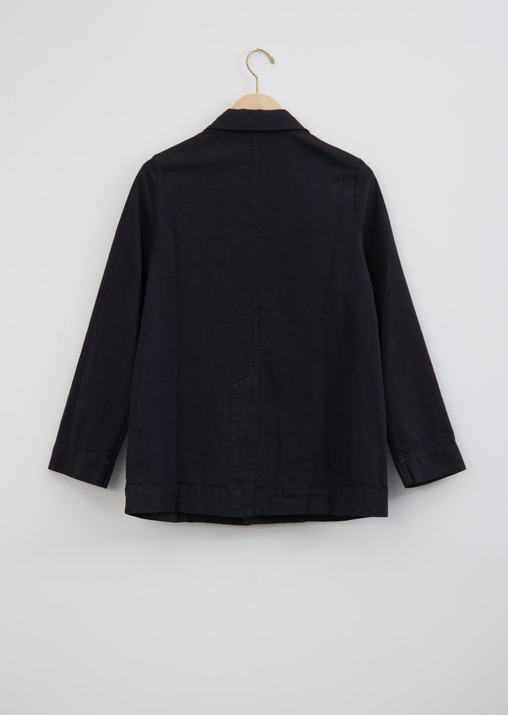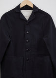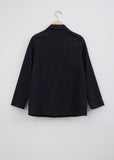 Toogood Photographer Jacket in flint color. This signature black work jacket crafted from cotton canvas by the British label features two raised patch pockets and a small notch collar.