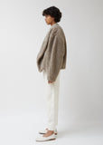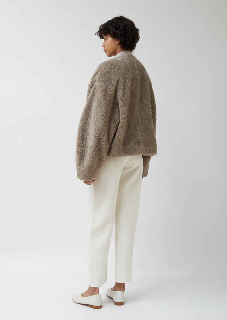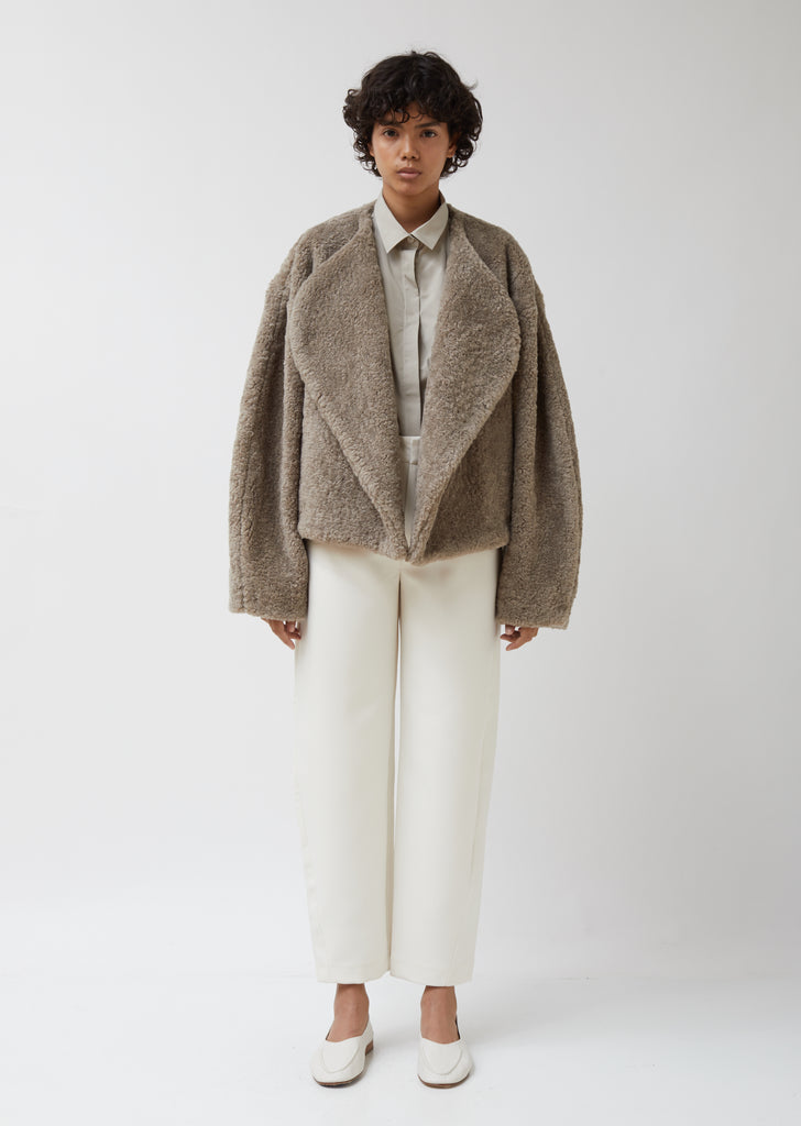 Cropped open-front jacket in fog-grey teddy-bear faux fur, finished with sculpted, tapered balloon sleeves. Outsized, rounded-edge lapels. Long sleeves. Cropped at upper hip. Straight hem. Oversized, boxy fit.