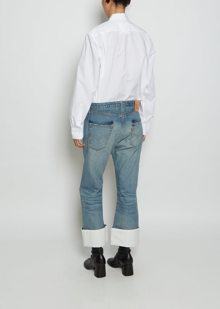 Junya Watanabe light indigo re-purposed 5-pocket Levi's denim jean with a wide cuff in contrast white cotton.