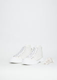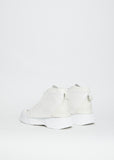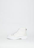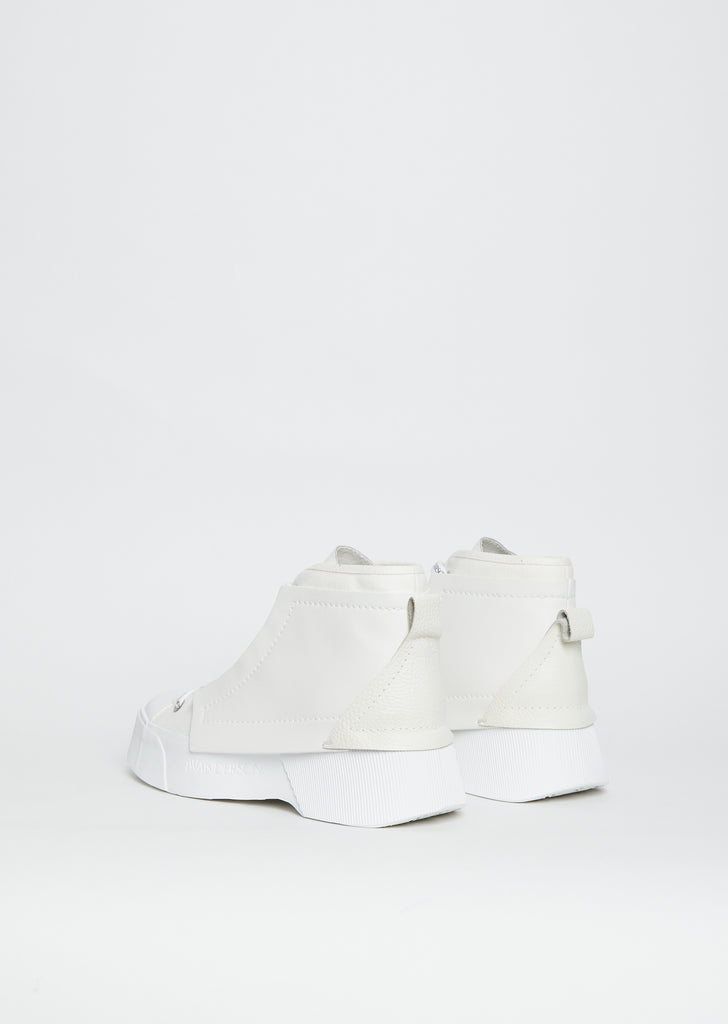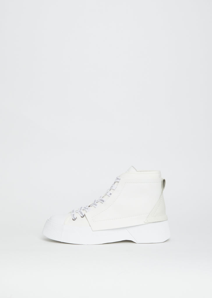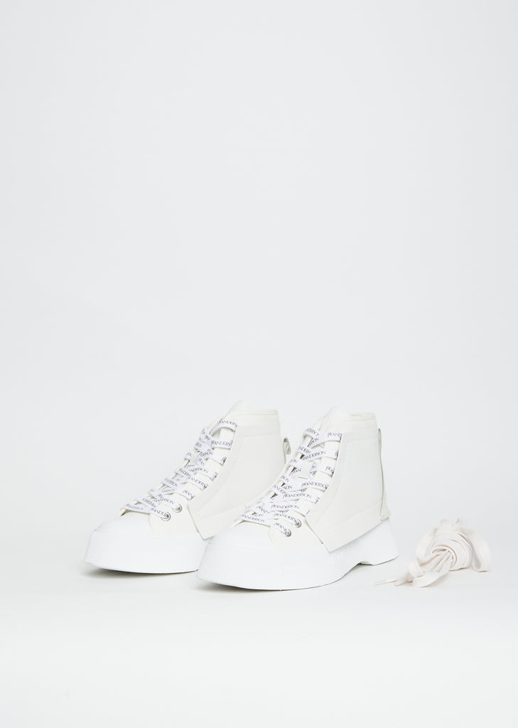 JW Anderson white high-top sneakers in leather and canvas featuring a paneled design with white topstitching. Almond toe. Pull-tab at heel. Chunky rubber sole with embossed logo at side, and logo print laces. Solid white laces also included.