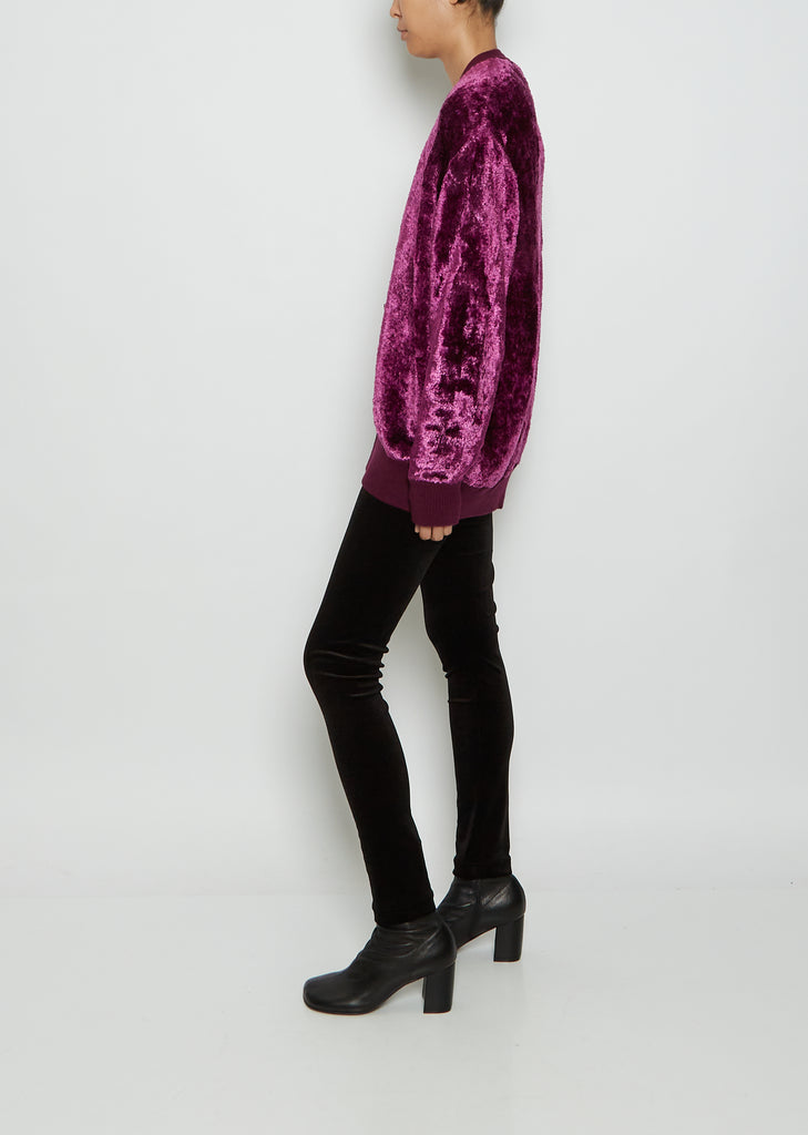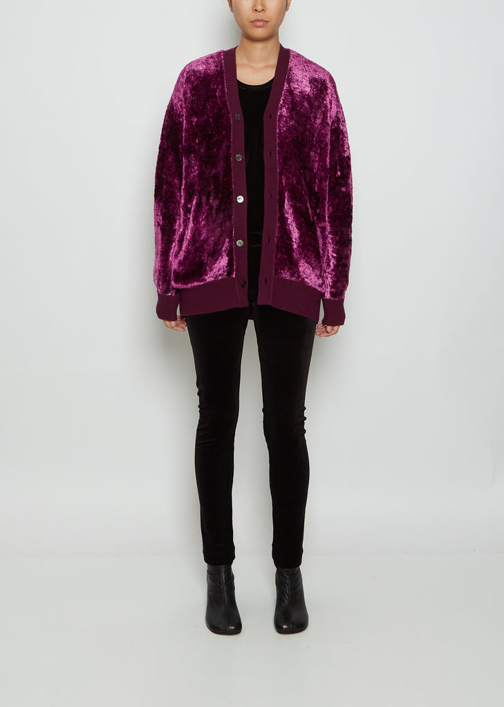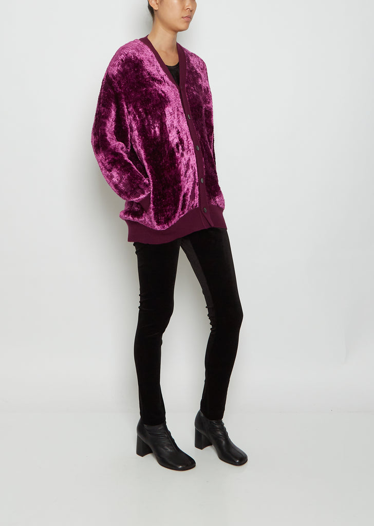 Junya Watanabe purple v-neck cardigan sweater with side seam pockets in a crushed velvet chenille knit.